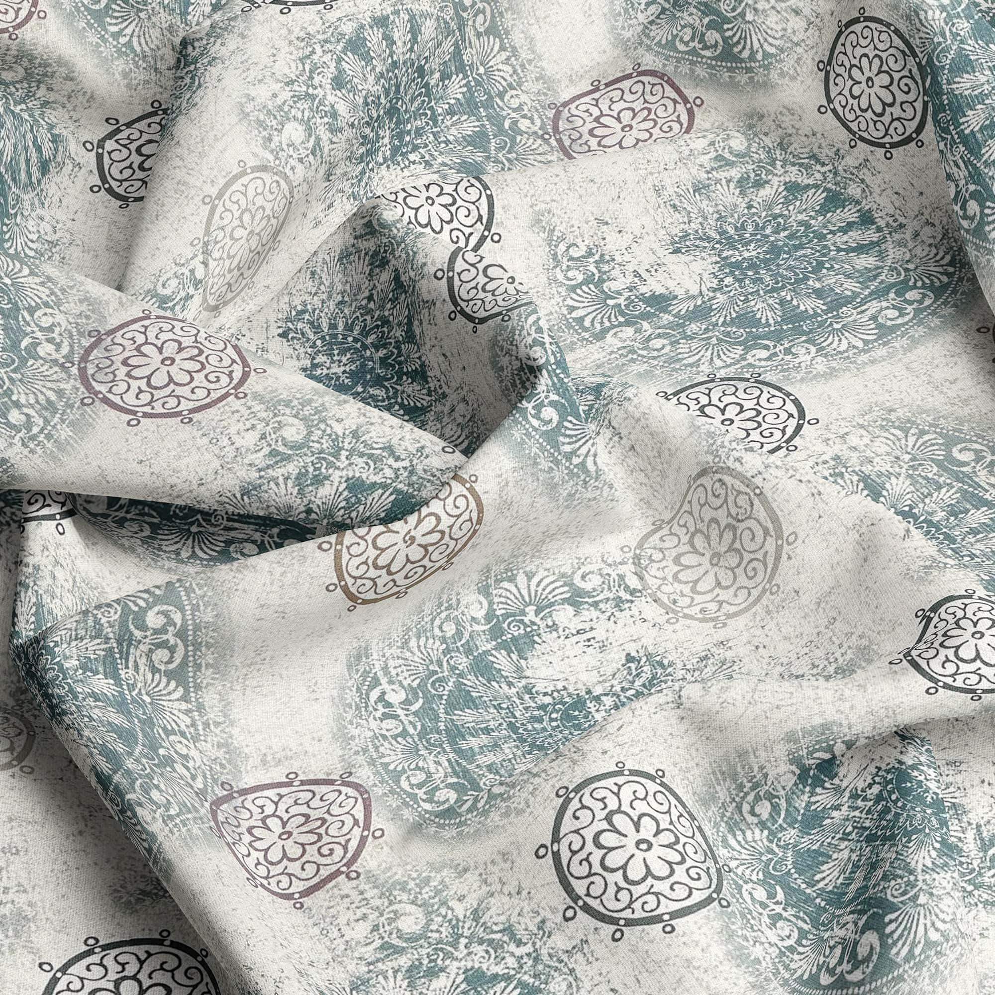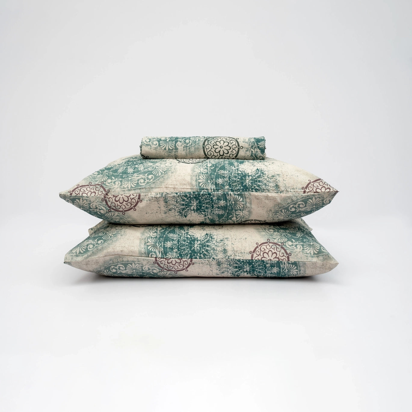Introduce a touch of old-world charm to your space with the Aegean Breeze Set. Made from premium cotton percale, this bedding offers the signature crispness and matte finish that cotton percale is known for, providing a wonderfully cool and fresh feel.The design features an attractive, repeated medallion and circular motif with a subtle distressed or washed effect, reminiscent of classic tilework or ancient patterns. The color palette centers on shades of deep teal and faded seafoam green against a soft ivory background, punctuated by small accents of brown/taupe. This pattern creates a sense of depth and bohemian elegance, perfectly suited for adding character and texture to any bedroom.