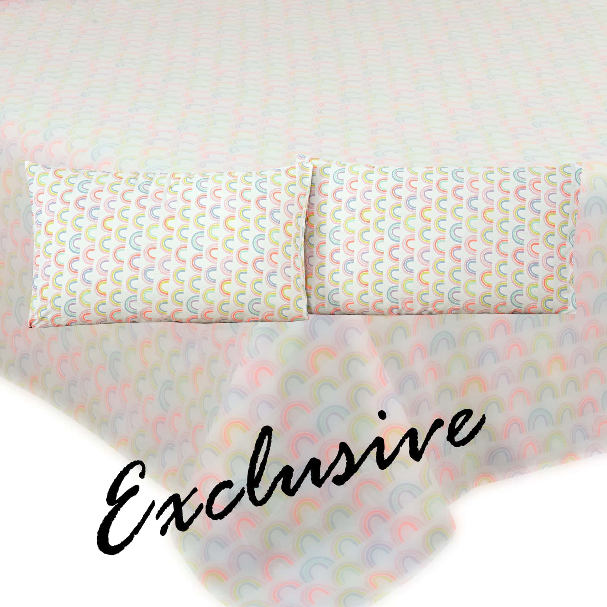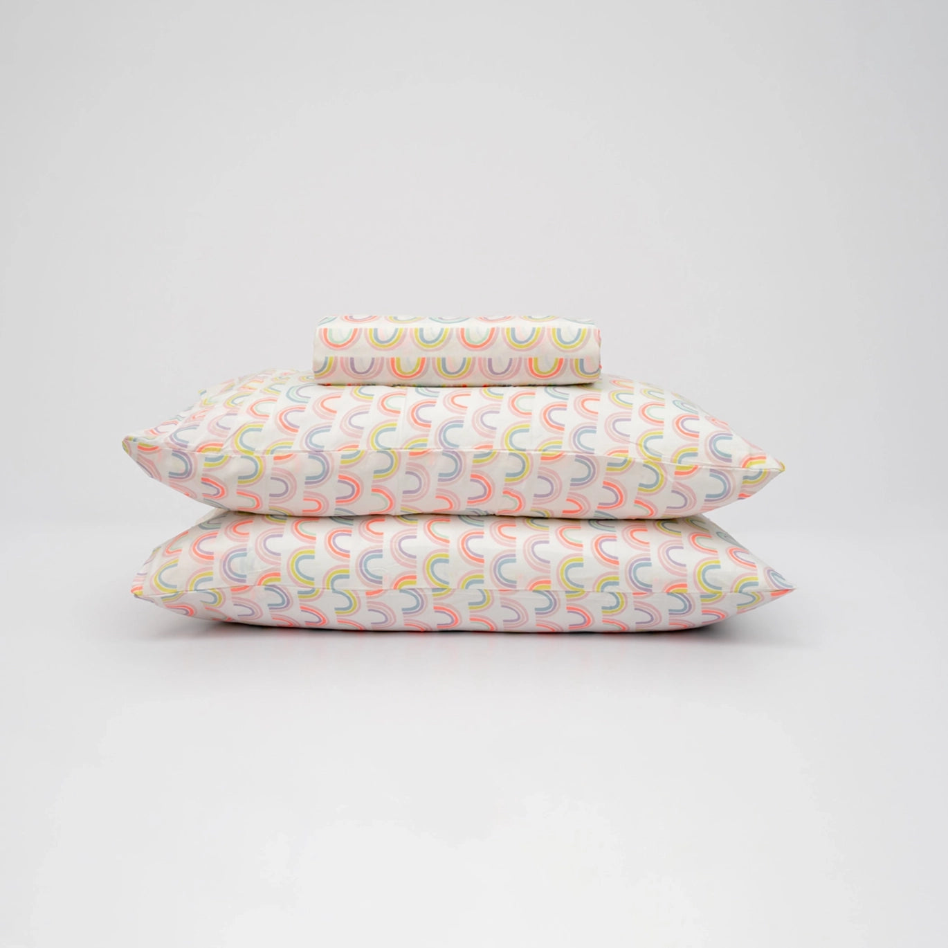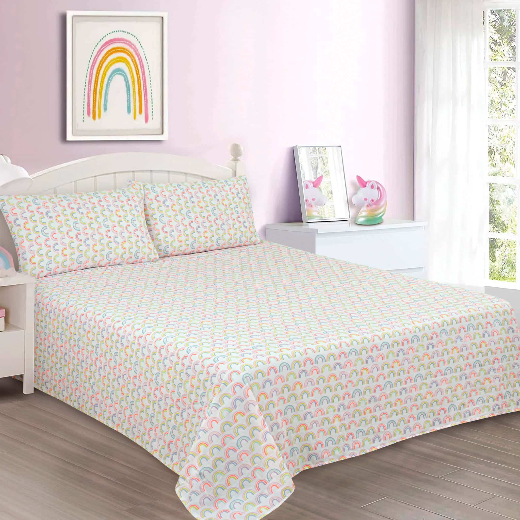 Brighten your bedroom with the charming and playful Pastel Rainbow Bedsheet Set. Constructed from high-quality cotton percale, this bedding offers a refreshingly crisp, smooth, and cool-to-the-touch surface, perfect for a comfortable night's sleep. Percale is celebrated for its matte finish and exceptional durability, improving in softness with every wash.The design features a repeating, cheerful pattern of miniature, curving rainbow arches arranged in neat rows. The color scheme is soft and gentle, utilizing muted pastel tones like light pink, mint green, soft yellow, and pale grey against a white background. This subtle yet whimsical print adds a lighthearted, airy, and modern-fun aesthetic to your space, making it an ideal choice for a bright and welcoming room.