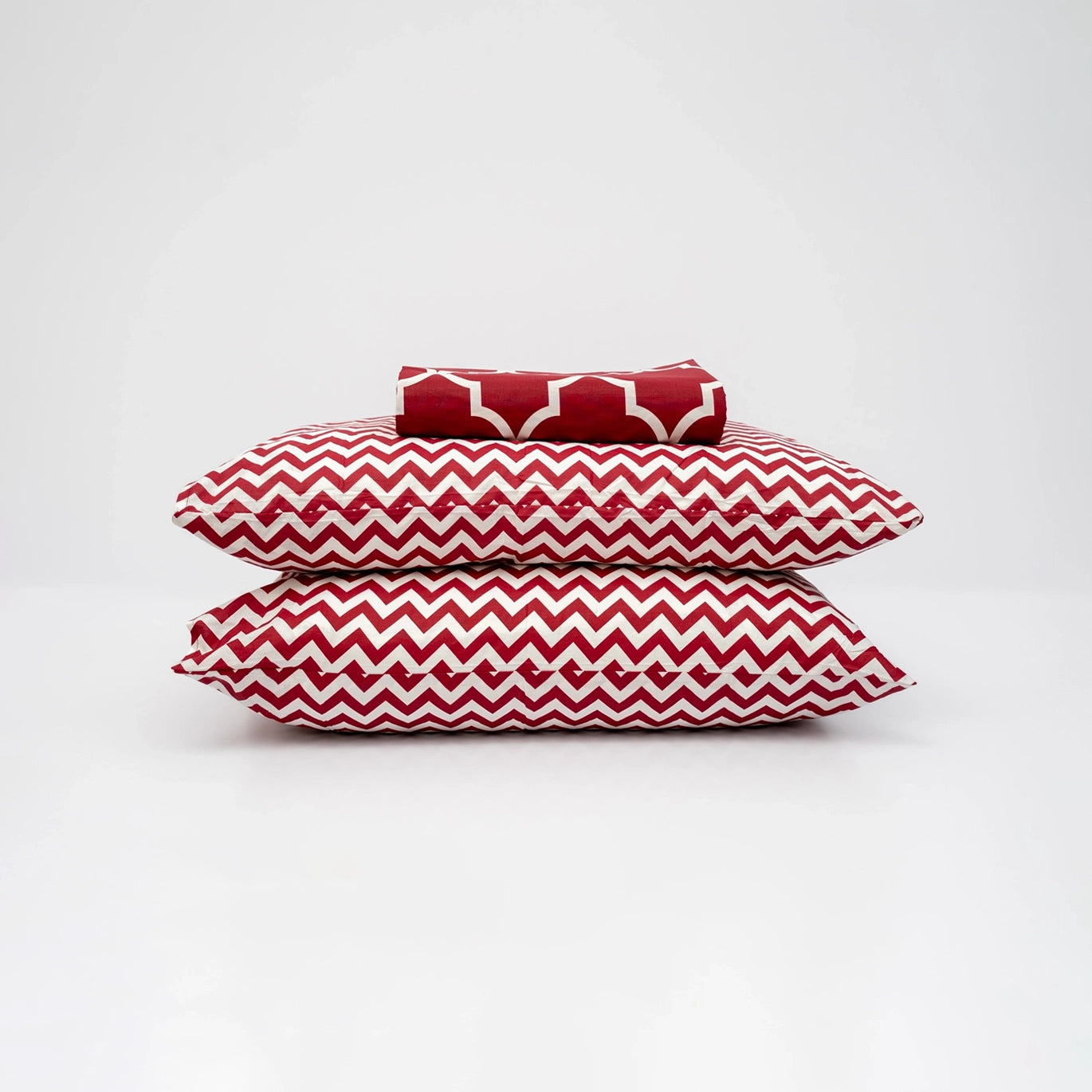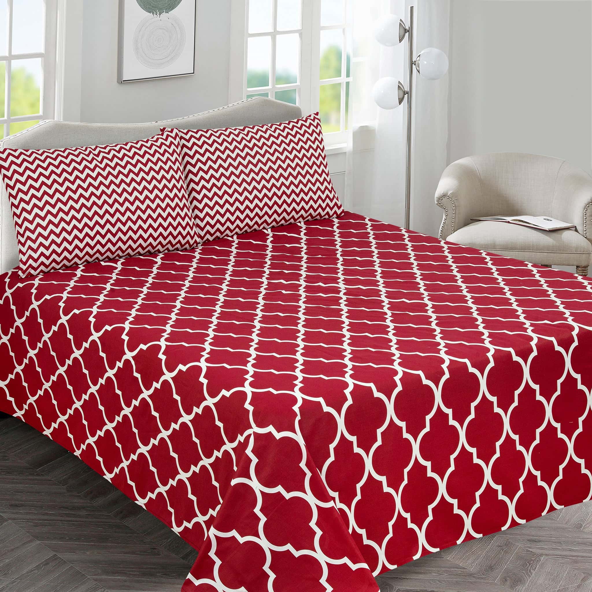Experience Lattice Luxe, the ultimate blend of comfort and style. This deep crimson red sheet set features a sophisticated white Moroccan geometric pattern, instantly elevating your bedroom aesthetic.Crafted from premium cotton percale, the fabric offers a crisp, cool feel and exceptional durability, becoming softer with every wash. The breathable 100% cotton percale construction ensures a comfortable night’s sleep, keeping you cool and fresh. Add a touch of luxury and modern pattern to your sanctuary.