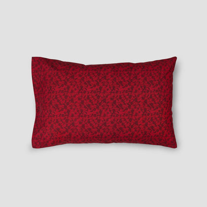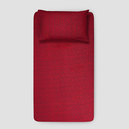 This is an overhead shot featuring a single bed dressed in a richly colored crimson or wine-red fitted sheet and matching pillow. The pure cotton fabric displays a subtle, tight printed or woven pattern across its surface, giving it texture. The bed is centrally placed on a background that transitions from a deeper red/pink wall to a floor area where a small, colorful patterned rug and a side table with a lamp are visible. This sheet set offers a bold, warm, and inviting color statement, ideal for adding deep color to a small bedroom.