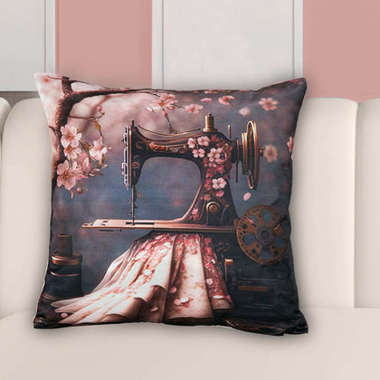 Elevate your home décor with our stunning Cushion Cover crafted from luxurious Digital Silk fabric. The dark blue or black base beautifully enhances the intricate patterns of pink, brown, and beige gears, clocks, and a mannequin wearing a dress, making it a striking addition to any space.