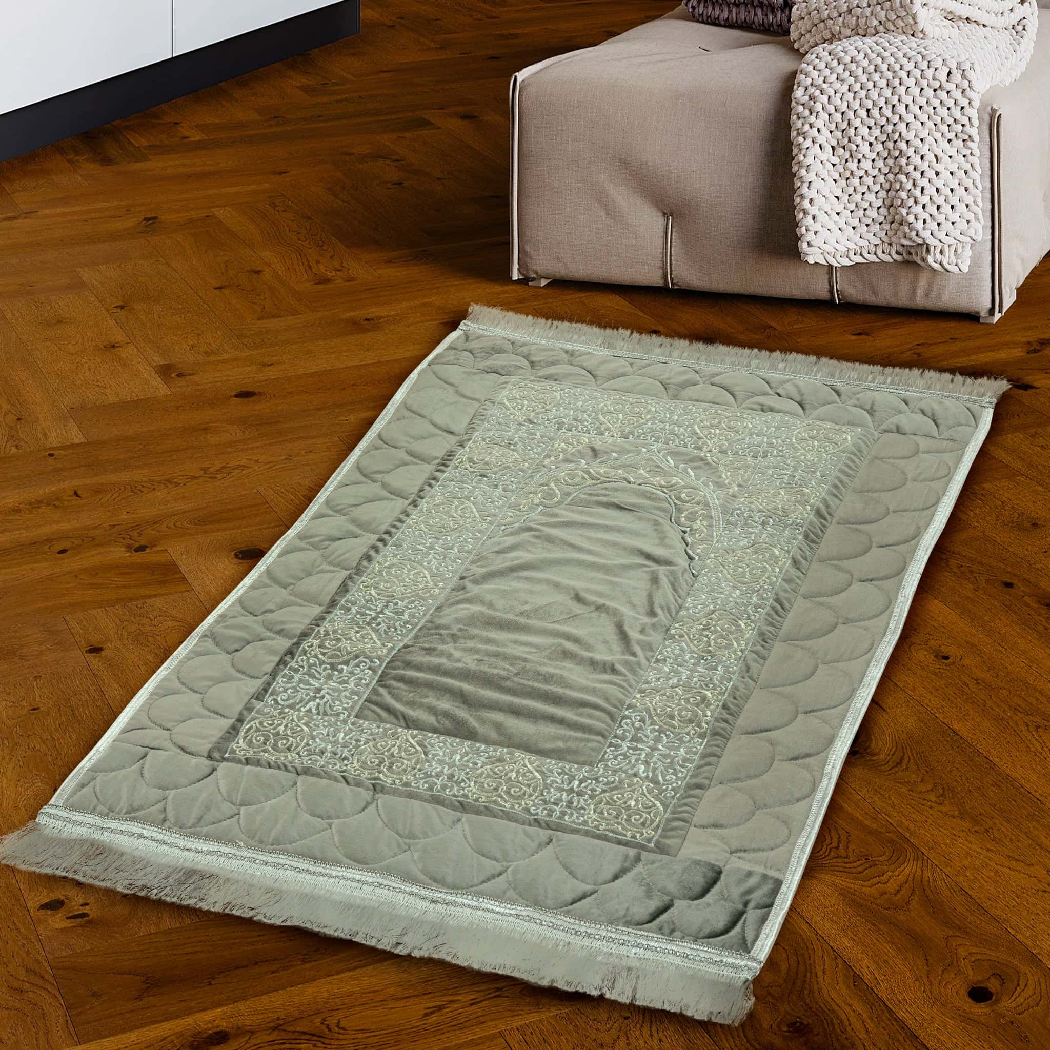 Experience the artistry of Islamic embroidery with our Embroidered Prayer Mat. The intricate floral motifs, stitched in light tones, add a touch of elegance to your prayer area. The single-color prayer mat creates a visual appeal like no other.