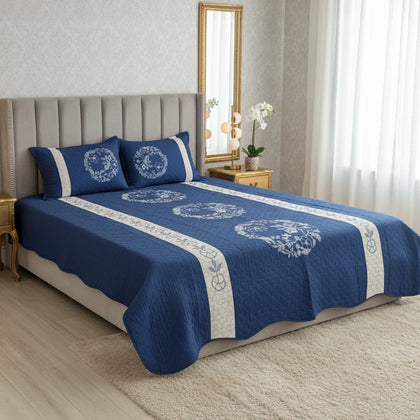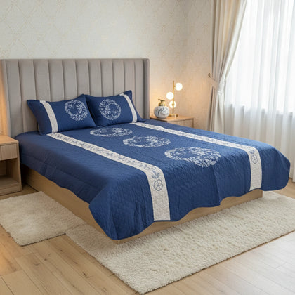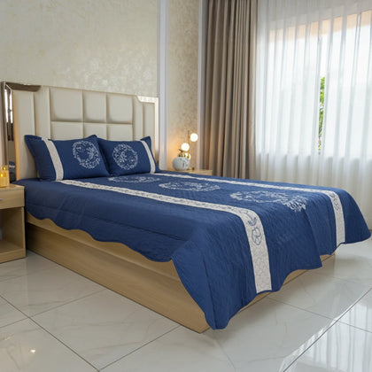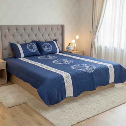 Introduce a touch of timeless elegance with our Navy Blue Embroidered Quilted Cotton Set. The rich navy blue base is crafted from soft cotton and features subtle all-over quilting for lightweight warmth and texture. This sophisticated set is defined by its exquisite detailing: three central white embroidered medallions create a striking focal point, complemented by elegant white and grey embroidered floral borders running down the length of the bed. The matching shams echo the circular embroidery, completing a polished, high-end look. Breathable and comfortable, this set is perfect for layering or use as a lightweight bedspread year-round.