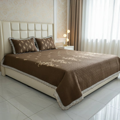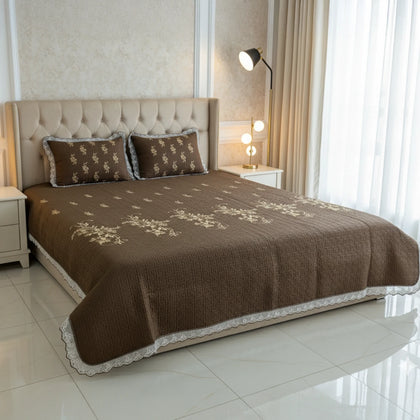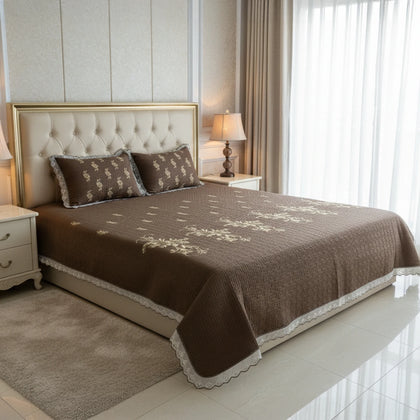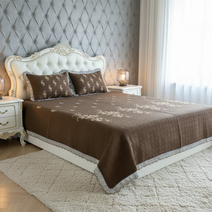 Wrap your bed in classic elegance with our Chocolate Brown Embroidered Quilted Cotton Set. This luxurious bedspread features a deep, inviting chocolate brown hue, crafted from soft, breathable cotton with a subtle quilted texture for lightweight warmth. The design is elevated by exquisite ivory floral embroidery gracefully flowing across the center, adding a sophisticated contrast. Delicate white lace trim borders the edges of the bedspread and shams, enhancing its vintage charm. The matching shams feature complementary embroidery, completing a cohesive and opulent look. This set is perfect for adding rich color, cozy comfort, and intricate detail to your bedroom decor.