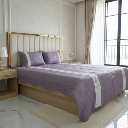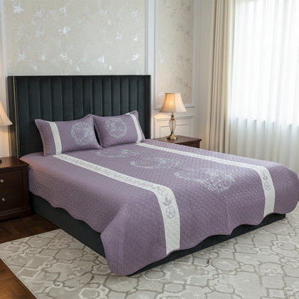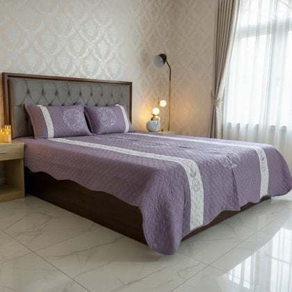 Brighten your sanctuary with our charming Lavender Embroidered Quilted Cotton Set. The soft, calming lavender/light purple base is crafted from breathable cotton and features a subtle, all-over quilted texture, providing a light yet comforting layer. This stylish set is accented by its exquisite detailing: three central white embroidered medallions create a beautiful focal point, beautifully framed by clean white side panels with delicate stitched floral details. The matching pillow shams also feature the circular embroidery. Perfect for adding a fresh pop of color and sophisticated embroidery to your decor while ensuring cozy, year-round comfort.