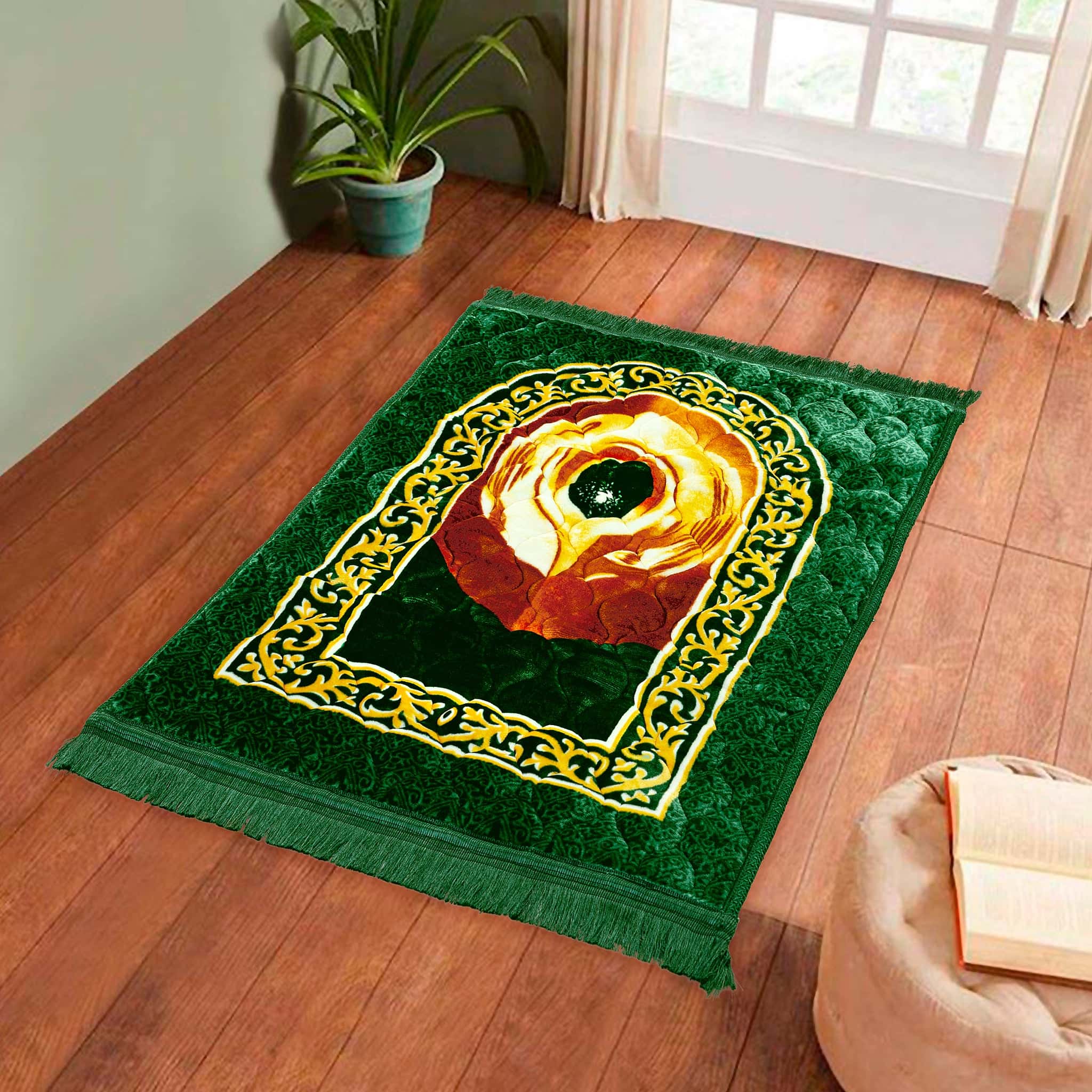 Achieve inner peace with our Printed Design Prayer Mat. The calming emerald watercolor print, accentuated by the gold Hajra-e-Aswad motif at the center, creates a serene atmosphere. Each prayer becomes a moment of peace and reflection, enhancing your spiritual experience.
