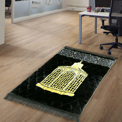 At the heart of this extraordinary prayer mat lies a magnificent mihrab, printed in resplendent gold, serving as a beacon of spiritual alignment and focus for your prayers. Encircled by lush maroon velvet borders, the mihrab creates a sacred focal point that draws you into a realm of transcendence and connection with the divine.