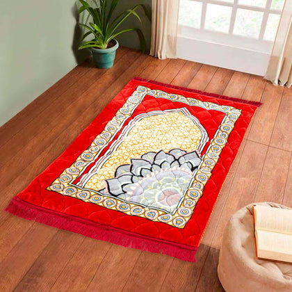 At the heart of this extraordinary prayer mat lies a magnificent mihrab, printed in resplendent gold, serving as a beacon of spiritual alignment and focus for your prayers. Encircled by lush maroon velvet borders, the mihrab creates a sacred focal point that draws you into a realm of transcendence and connection with the divine.