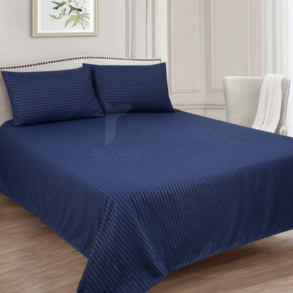 Envelope your bedroom in tranquility with this striking Deep Midnight Blue Stripe Sheet Set. The intense, true-blue color evokes a sense of deep calm and luxury, making it a perfect anchor for any contemporary or classic bedroom design.Woven from high-quality cotton satin, these sheets boast a remarkable smoothness and a subtle, beautiful sheen that drapes elegantly over your bed.The fabric features a smooth finish and an elegant woven stripe pattern, adding subtle texture and a sophisticated.