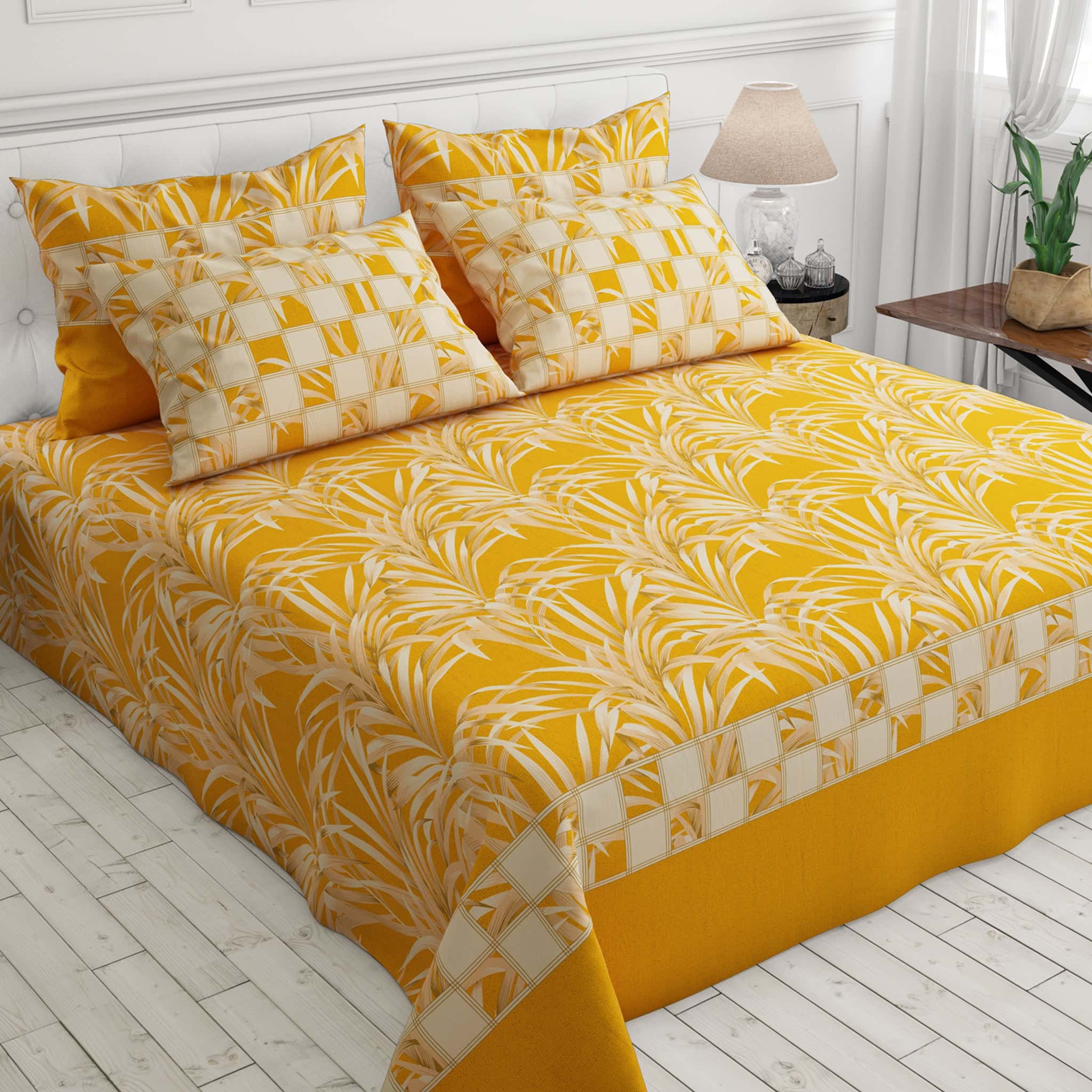 Elevate your bedroom decor with our Mustard Leaf Sateen Bed Sheet Set - 6963. Crafted from luxurious sateen fabric, this set features a stunning mustard leaf design that brings warmth and vibrancy to your space. The silky smooth texture ensures a comfortable night's sleep, while the elegant look transforms your bed into a stylish retreat. Upgrade your bedding collection with this irresistible blend of comfort and style. Experience relaxation like never before.
