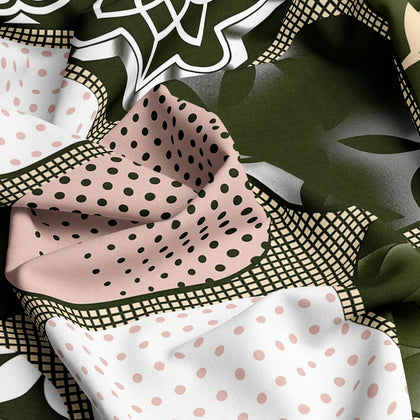 Design: A sophisticated blend of geometric and floral patterns in soothing olive, beige, and white tones.