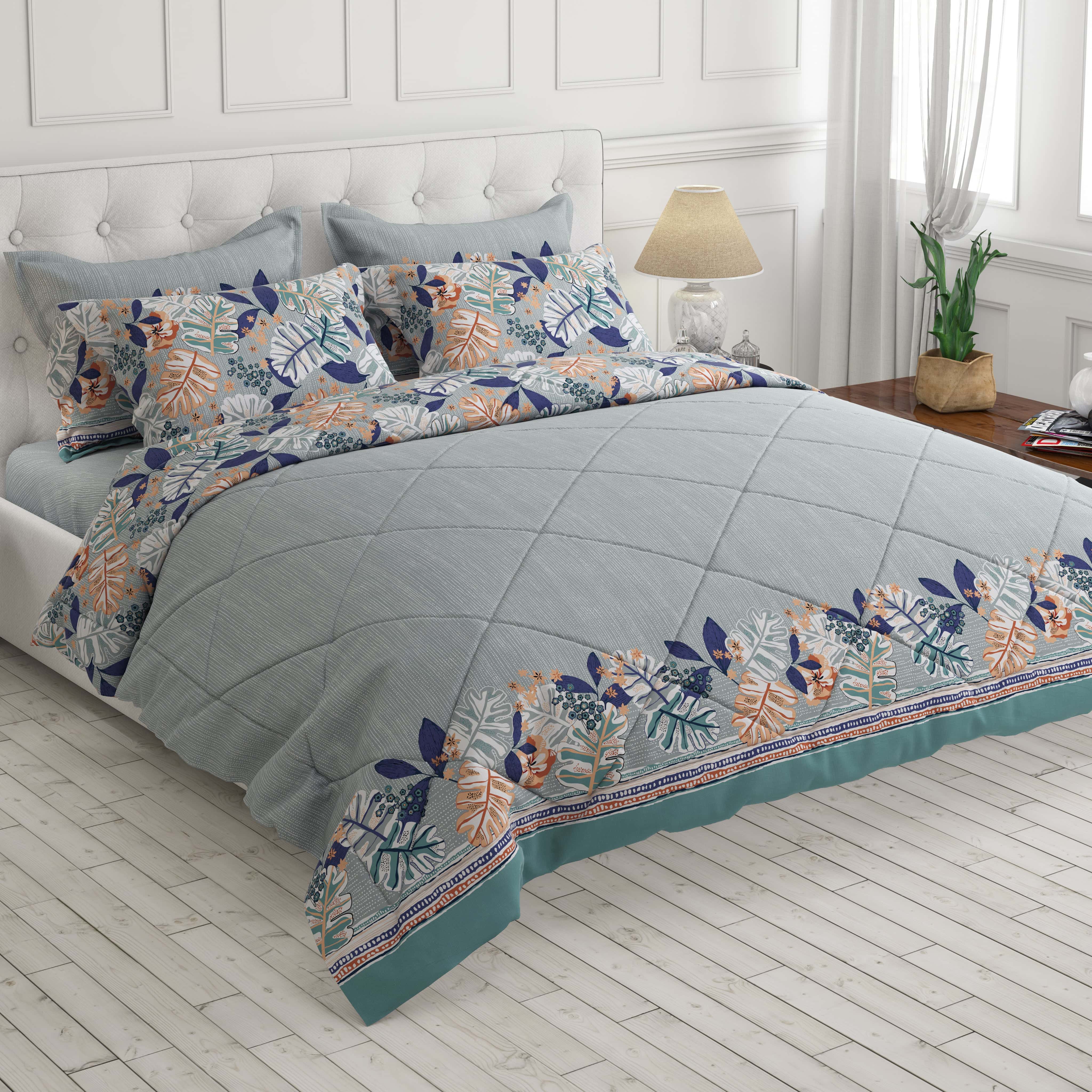 Transform your bedroom with the Sateen Comforter Set 7599. Crafted from luxurious Sateen fabric, this set not only offers visual appeal with its elegant white base and vibrant blue and orange design but also ensures a cozy and restful sleep. Its 200 GSM polyester filling provides the perfect balance of warmth and breathability.
