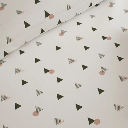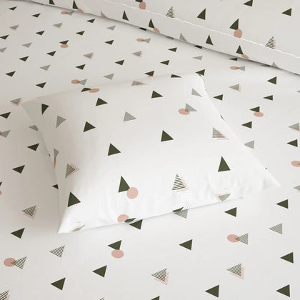 The bedsheet is covered with a modern, crisp white sheet set that features a distinctive, repeating geometric pattern. This design consists of numerous small, scattered triangles in a muted color palette, primarily grey, black, and light brown/pink. The smooth, non-creased appearance of the fabric suggests a high-quality material sateen.The set includes a duvet cover, two pillow shams, and a small decorative pillow, all matching the geometric design.