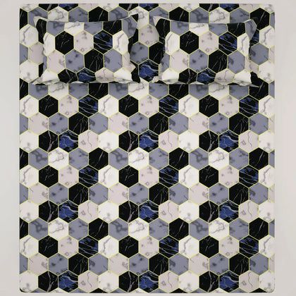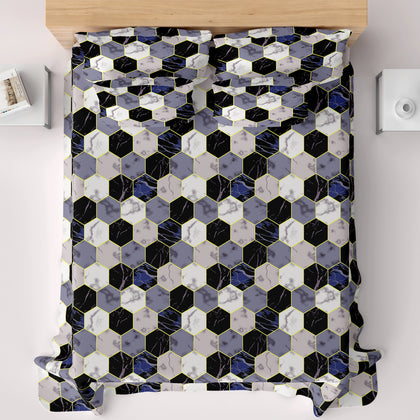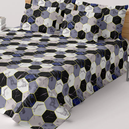 This bedsheet set introduces a powerful blend of modern geometry and luxurious texture,The focal point is a bold, all-over pattern of large interlocking hexagons. Within each geometric shape is a complex print that mimics the natural veining of marble, featuring distinct cells of deep navy/black, rich violet/mauve, and crisp white/light gray. The entire motif is accented by shimmering gold-toned lines that outline each hexagon.Crafted from luxurious Sateen fabric, the material provides a silky-smooth hand-feel and a refined sheen