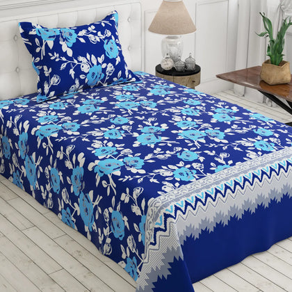 Dive into deep, calming hues with the Marine Flower Bedsheet Set.The sheet and the two pillow covers have a pretty pattern of large flowers in light blue and white colors. It looks very fresh and peaceful.At the bottom edge of the sheet, there is a straight border with a neat zigzag design in grey and white. This simple pattern looks nice against the flowers.Crafted from a fabric sateen high-quality cotton based on the drape that promises a smooth, soft feel, this set is perfect for adding depth, warmth, and a touch of golden luxury to your sleeping space.