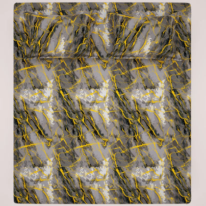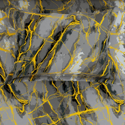 This exquisite bedsheet set is a statement piece, blending the timeless luxury of natural stone with modern glamour.The sheet features a dramatic, all-over pattern that flawlessly mimics grey marble. Rich charcoal and slate tones swirl across a lighter grey base, capturing the deep, natural veining of marble. The entire design is dramatically accented by striking, shimmering gold lines that crisscross the sheet, Crafted from luxurious Sateen fabric, the material provides a signature silky-smooth hand-feel and a beautiful sheen.