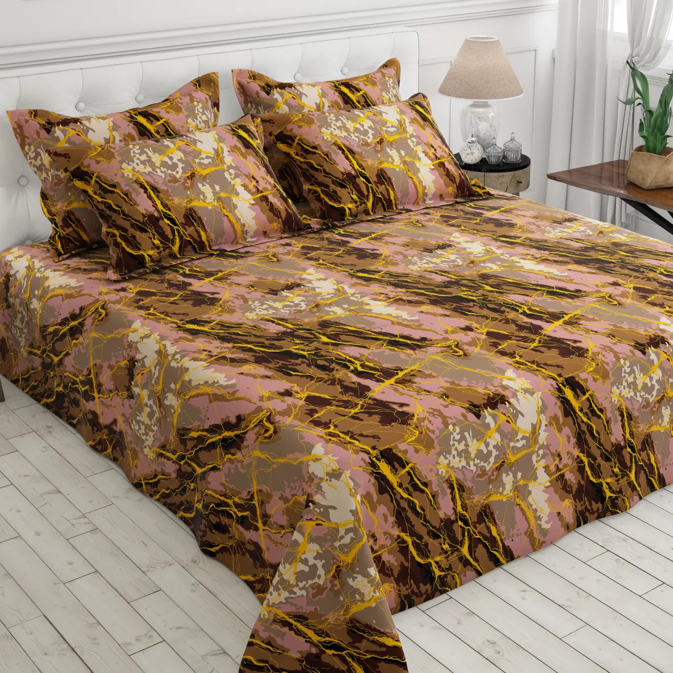 Give your bedroom a rich and stylish look with our Bronze Marble bedsheet set. The unique marble pattern in shades of bronze, gold, and brown adds a warm, elegant touch to your room.Made from soft cotton blended fabric, this bedsheet feels smooth, comfortable, and durable.The earthy colors and modern marble design make it perfect for both classic and modern home decor styles.