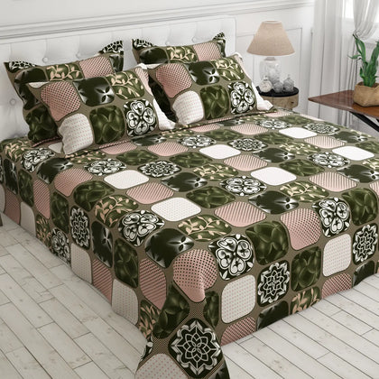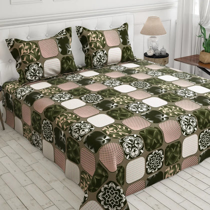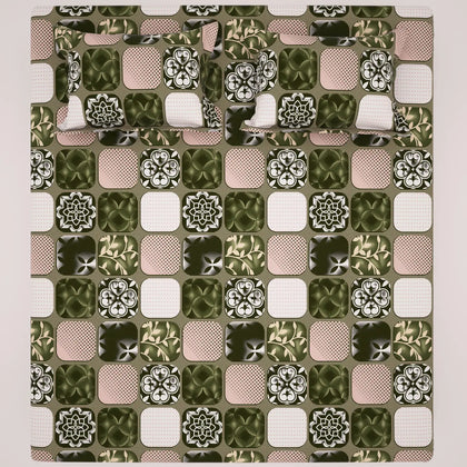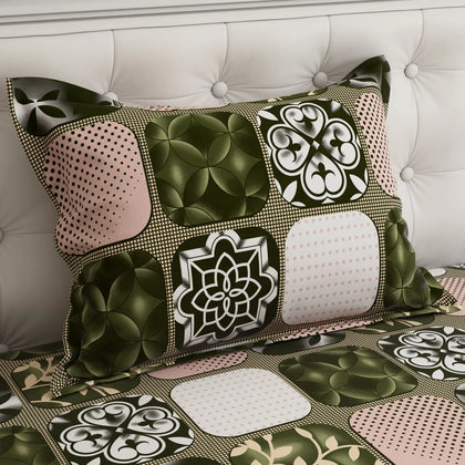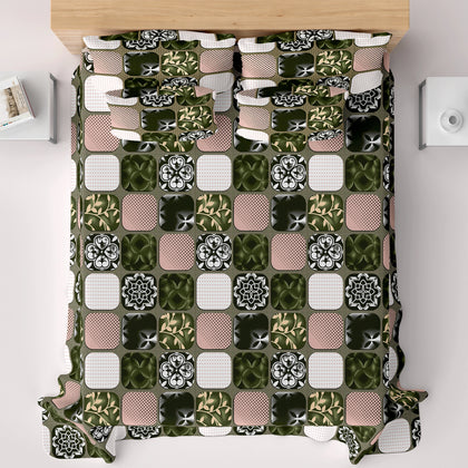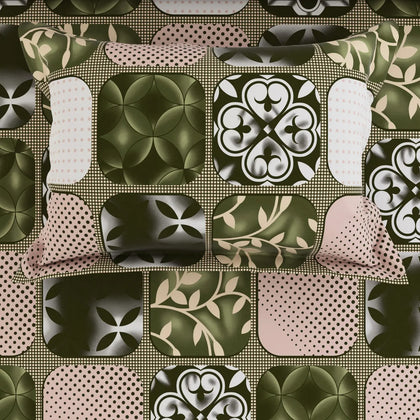 This bed sheet set, which we can call Patchwork Green features a rich, structured design and is made from a comfortable sateen fabric.The sheet showcases a prominent mosaic or patchwork pattern composed of squares. These squares contain various intricate geometric and floral tile prints. The color palette is rich and earthy, dominated by shades of olive green, moss green, deep brown, and ivory/beige, giving it a warm, sophisticated, and handcrafted feel.