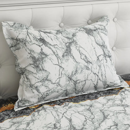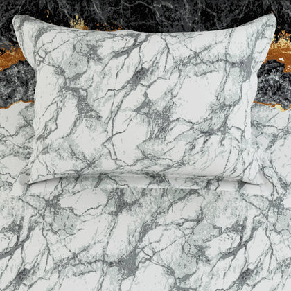 Add a touch of bold sophistication to your bedroom with our Lava Marble Sateen Bed Sheet Set.The design showcases a striking marble-inspired pattern, blending shades of black, grey, white, and molten gold. The contrasting tones create a lava-like flow effect, symbolizing strength, luxury, and timeless beauty.Crafted from premium cotton sateen, this bedsheet offers a silky-smooth texture and a subtle sheen that enhances the elegance of your space.