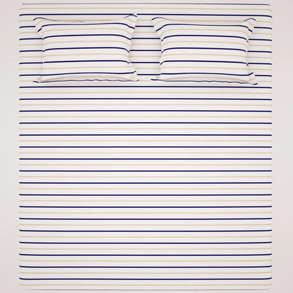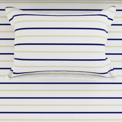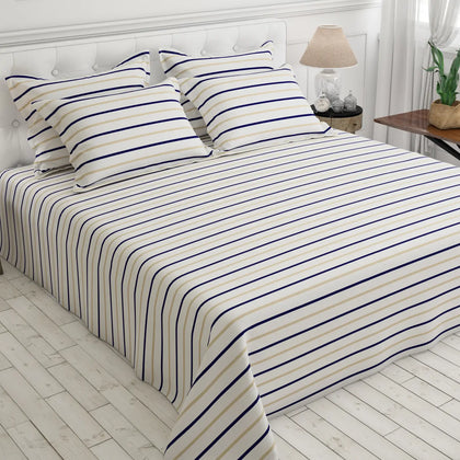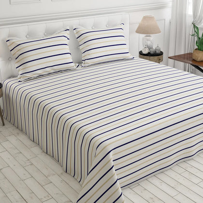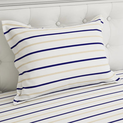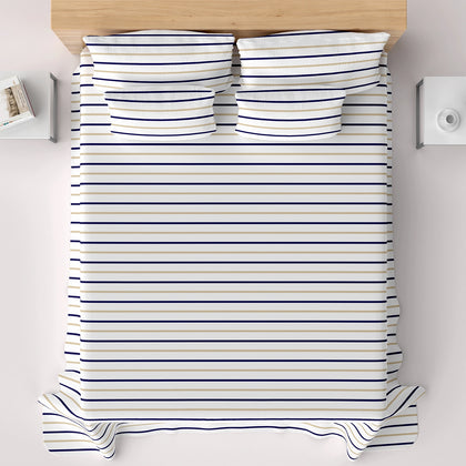 Transform your space with the timeless elegance of our Nautical Stripe Bedsheet Set. This design features crisp white fabric accented by sharp, thin horizontal stripes in a refined palette of deep navy blue and light tan/gold. This combination delivers a clean, classic, and sophisticated aesthetic perfect for any modern or coastal-inspired décor. The uniform stripes continue onto the matching pillowcases for a cohesive look. This pattern offers a sharp, defined visual that instantly brightens your room, making it a versatile and stylish choice that remains perpetually in fashion.