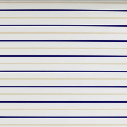 Color Palette: Crisp white base accented by deep navy/blue and light tan/gold stripes