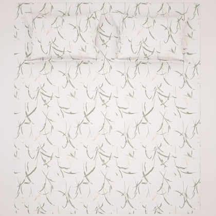 Bring home the soothing elegance of nature with our Sateen Bed Sheet Set. Crafted from premium cotton sateen,The design features soft green leafy patterns gracefully spread across a subtle white background, creating a calm, refreshing ambiance perfect for modern and minimal bedrooms.