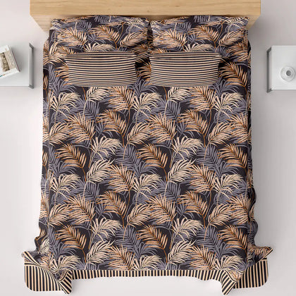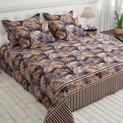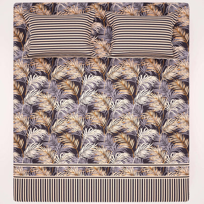 This bedsheet set is designed for simple elegance and comfort.A busy pattern of tropical leaves in soft, nature-inspired colours.A mix of deep brown, light beige, and grayish-purple for a rich, muted look.Features unique striped borders (vertical and diagonal) that frame the bed nicely.Made from Sateen fabric, which feels silky-smooth and soft against your skin. Looks sophisticated and modern, turning your room into a cozy, unique retreat.
