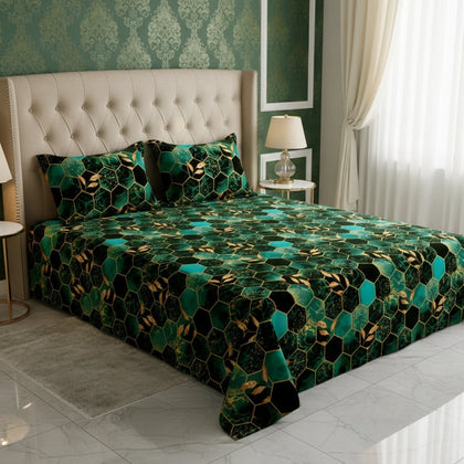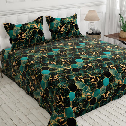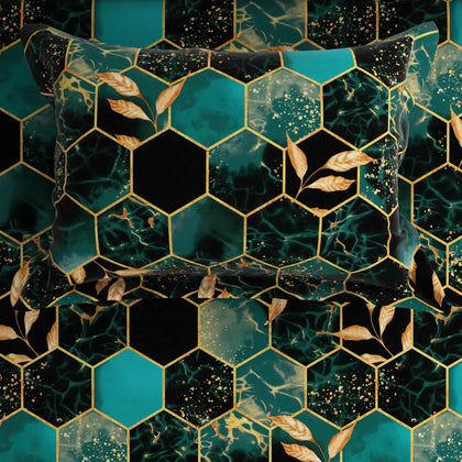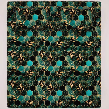 Transform your bedroom into a luxurious retreat with the Black Hexagonal Marble Effect Bed Sheet Set by Sateen. This stunning set features elegant hexagonal tiles adorned with a stylish marble effect and shimmering gold accents, making it perfect for a modern aesthetic. Crafted from high-quality sateen fabric, it offers a soft and silky touch for ultimate comfort. Elevate your sleep experience and showcase your taste with this exquisite bed sheet set that blends sophistication and style seamlessly.