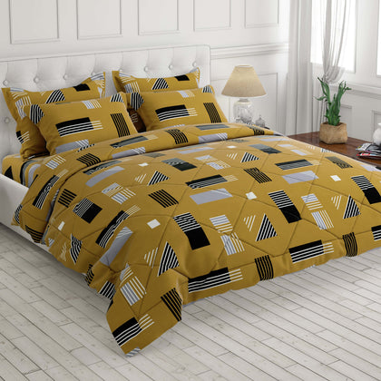 Transform your bedroom with the luxurious Sateen Comforter Set 7577 in Mustard. Crafted from premium Sateen fabric and filled with 200 GSM polyester, this comforter set combines style and comfort. The vibrant yellow base sets the perfect backdrop for its elegant white, grey, and black designs, adding a touch of modern sophistication to any decor.
