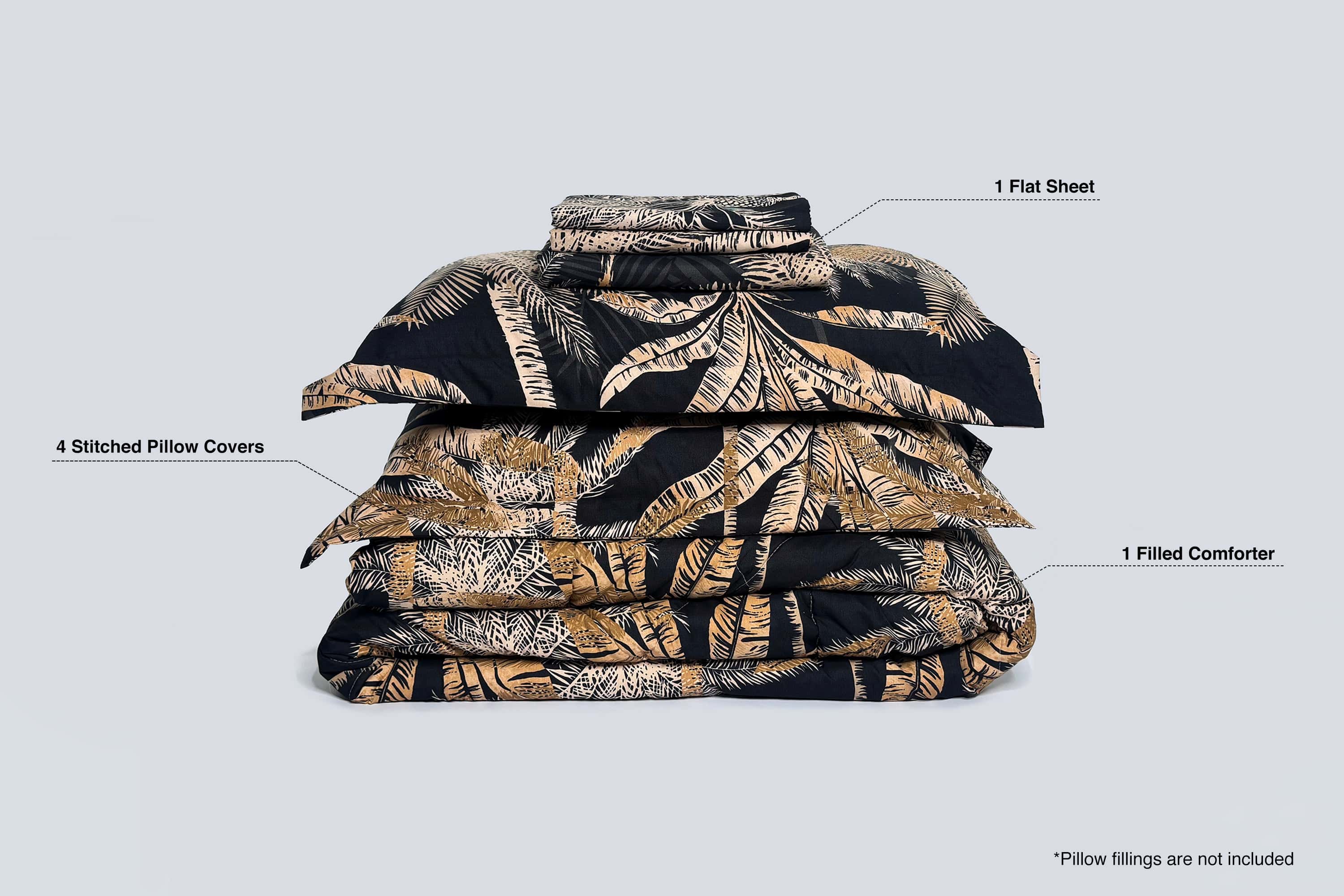 Transform your bedroom into a tropical paradise with our Black Palm Tree Sateen Bed Sheet Set. Crafted from luxurious sateen fabric, each sheet boasts a stunning black backdrop adorned with elegant palm tree designs, adding a touch of sophistication and relaxation to your space. Experience ultimate comfort and style while enjoying a restful night’s sleep. Perfect for those seeking a tranquil yet chic ambiance, this bed sheet set is a must-have for your home.