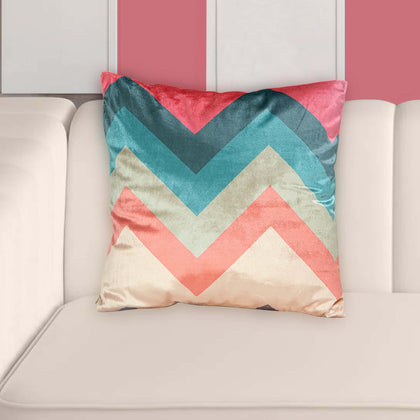 Transform your living space with our luxurious Velvet Cushion Cover. Featuring a pristine white base adorned with a stylish chevron pattern in pink, blue, grey, and beige, this cushion cover adds a touch of elegance and vibrancy to any decor.