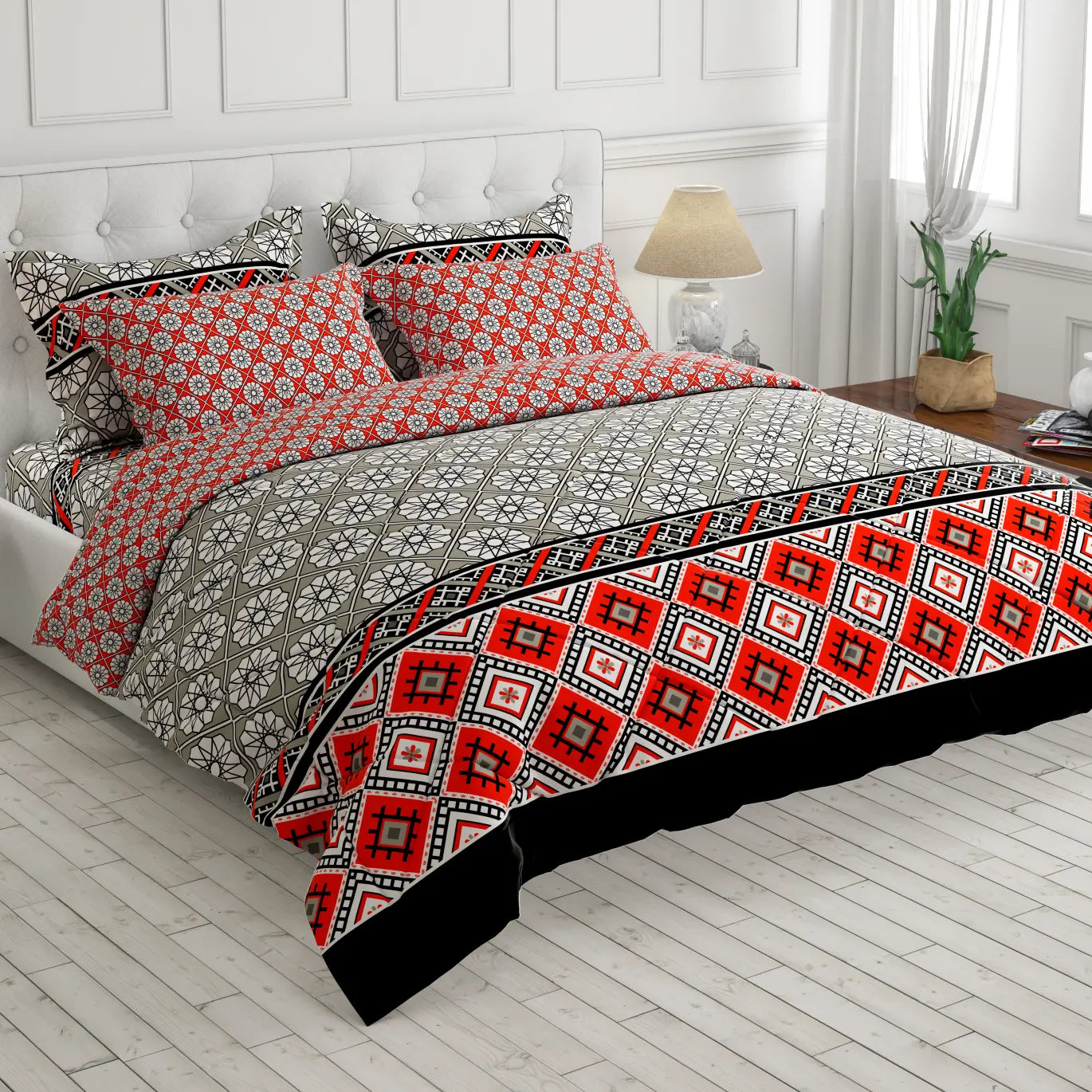 Experience style and comfort with our Geometric Weave Comforter Set, crafted from a premium cotton-blended fabric that ensures breathability and durability.The elegant geometric print in striking shades of red, black, and grey adds a modern yet traditional touch to your bedroom décor.Designed for both summer and winter use, this comforter provides year-round cozines