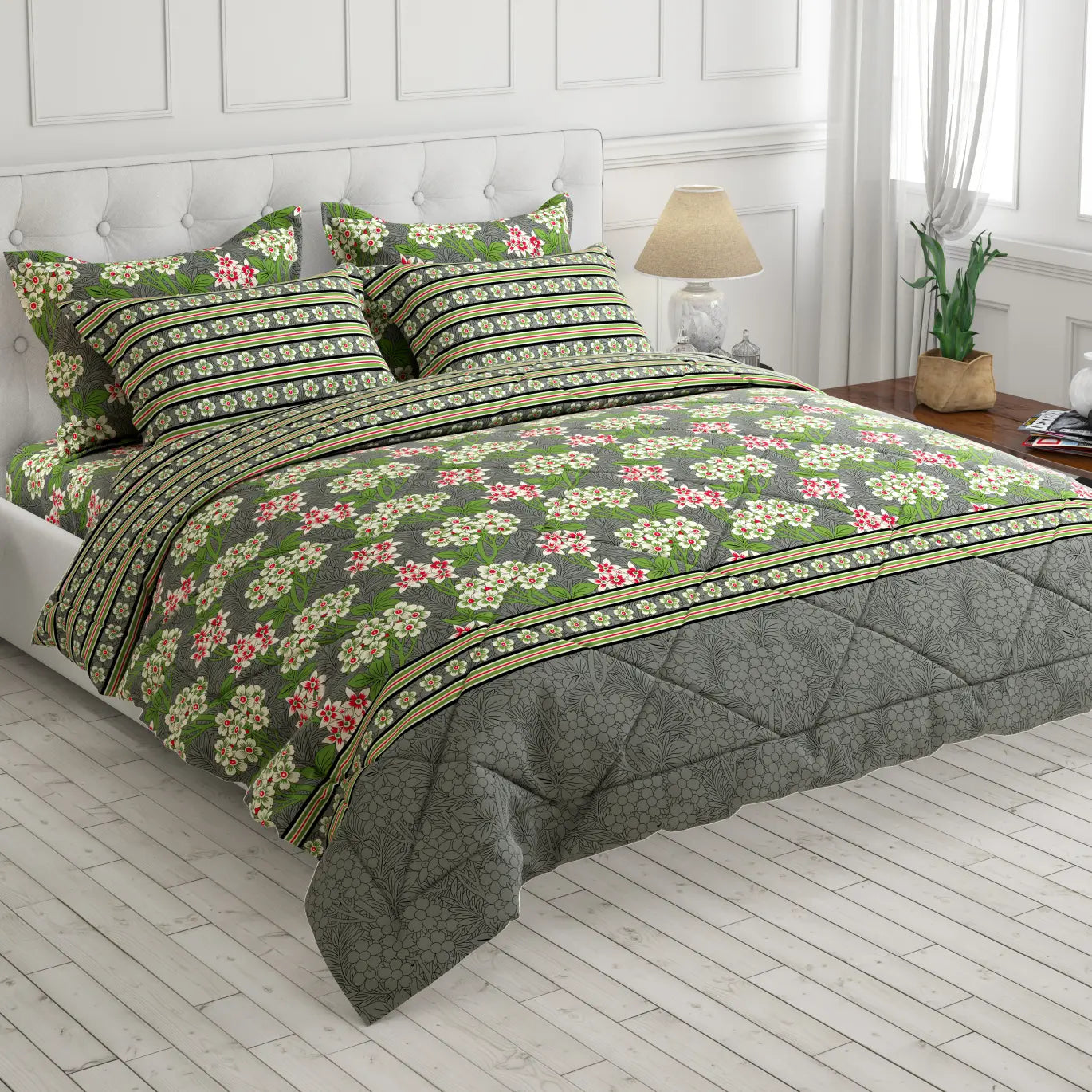 The design features a main field of stylized white and light pink florals set against a moss green and soft grey background. This floral section is framed by a bold, horizontally striped border that mixes thin lines of black, light yellow, and floral green.Crafted from premium cotton blended fabric, this comforter offers the perfect balance of softness, durability, and breathability, ensuring year-round comfort. Ideal for both summer and winter.