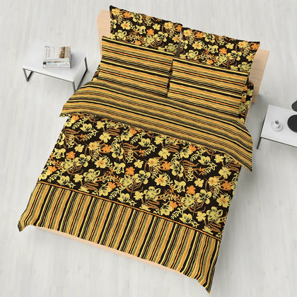Transform Your Bedroom with the sunshine bloom comforter set, The Design between bold, saturated stripes and a detailed floral print, creating a high-contrast and vibrant design.The palette is dominated by rich, warm tones of deep golden yellow, mustard yellow, and black. The black acts as a strong background, making the yellows and other accent colours (like subtle orange/mustard in the flowers) pop brilliantly.