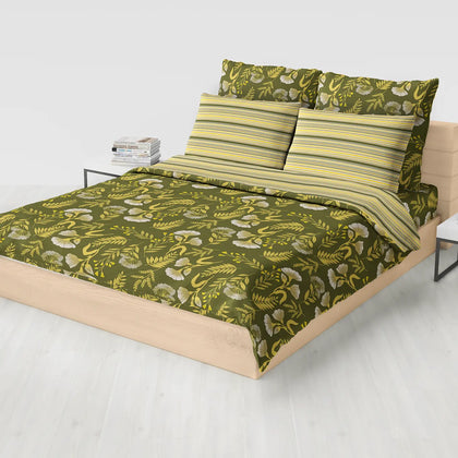 Transform your bedroom with beautiful yellow and cream floral print set against a rich, grounding olive green background. The botanical pattern is intricate yet delicate, offering a fresh, natural aesthetic that brings the tranquility of a garden indoors.The reverse side offers a crisp, contemporary contrast with a striped pattern. The stripes alternate between the soft yellow and the grounding olive green.The shell is constructed from a premium, breathable cotton-blend fabric, making it an ideal all-season comforter.