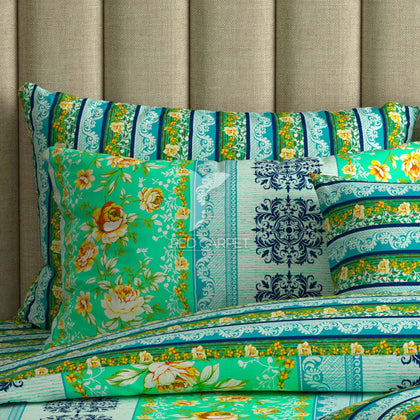 Transform your bedroom with the Xara Green Floral Stripes & Geometric Quilt Cover Set. Crafted from soft cotton-blended fabric, this stylish ensemble features a vibrant green floral design paired with modern stripes and geometric shapes. Experience comfort and elegance, making your sleep space a haven of tranquility.