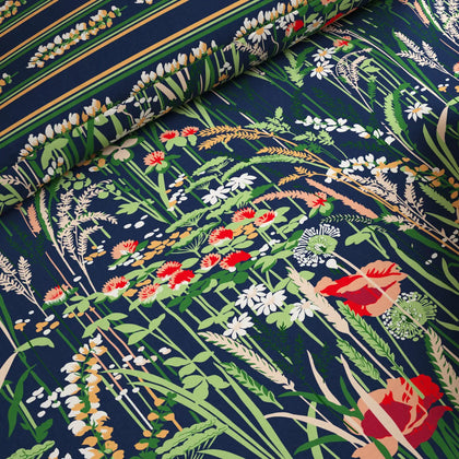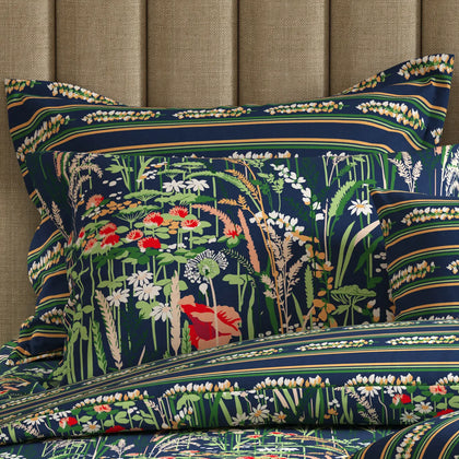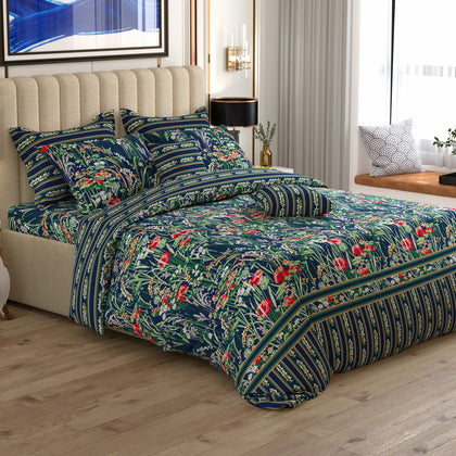 Escape into a lush, tranquil oasis with the Jungle Whisper 8-Piece King Reversible Quilt Cover Set. This vibrant ensemble features a rich deep navy background layered with a detailed, colourful botanical print of green leaves and pops of red-orange flowers. The design evokes the look of a dense, exotic garden.A tailored striped border in coordinating dark blue and light green hues adds a sophisticated finish. Crafted from a soft, high-quality cotton-blended fabric, this set ensures exceptional breathability, durability, and year-round comfort. The complete collection—including the reversible quilt, a fitted sheet, shams, pillowcases, and cushion covers—provides everything needed to effortlessly transform your master suite into a serene and stylish "Jungle Whisper" retreat.