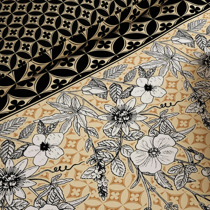 A luxurious bedset dressed in an 8-piece reversible quilt set that expertly combines two complementary patterns. The primary side features a large floral print in white and grey over a rich gold or deep orange background. The reverse side and the shams showcase a bold black-and-white geometric or spotted design, creating a striking contrast and sophisticated layered look. This set, with its mix of botanical and graphic prints, provides an elegant, high-contrast, and contemporary aesthetic.Crafted from a cotton blended comfortable, high-quality fabric,