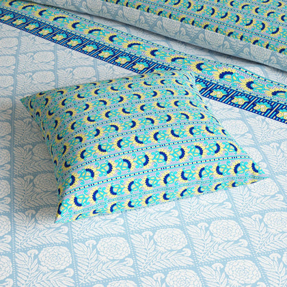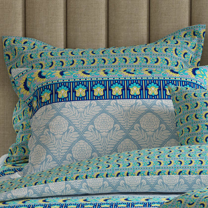 This is an 8-piece reversible king quilt set featuring a vibrant and intricate geometric and medallion pattern. The primary color palette is a refreshing mix of turquoise, mint green, and royal blue. The duvet cover showcases a large, ornate blue border on a light patterned background, while the multiple pillows display coordinating patterns and stripes. The set is styled against a beige tufted headboard in a bright room, offering a bold, contemporary, and ethnic-inspired aesthetic perfect for updating any bedroom.