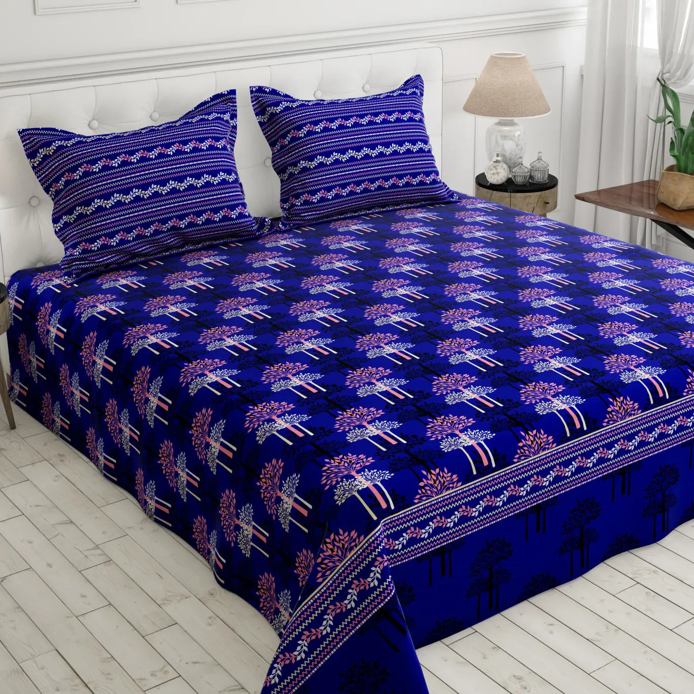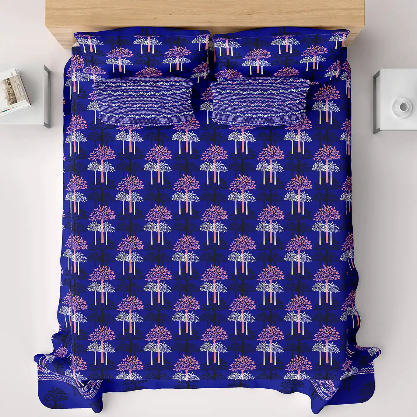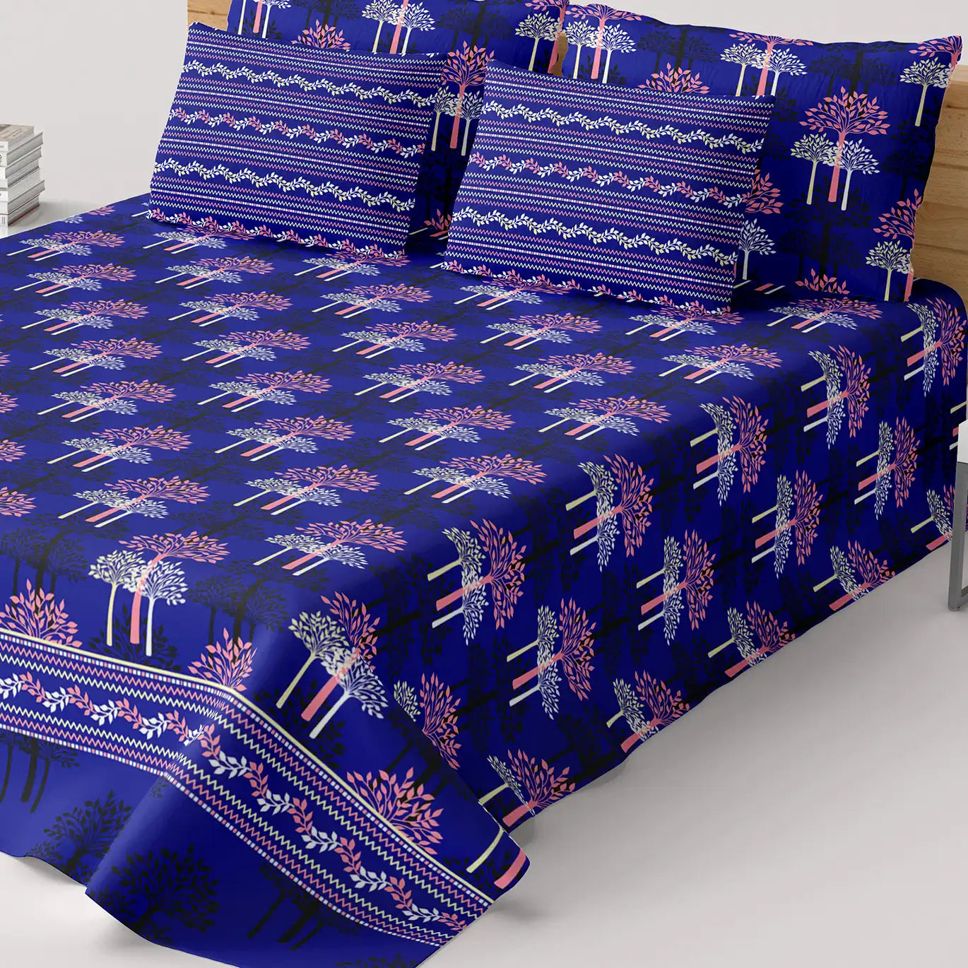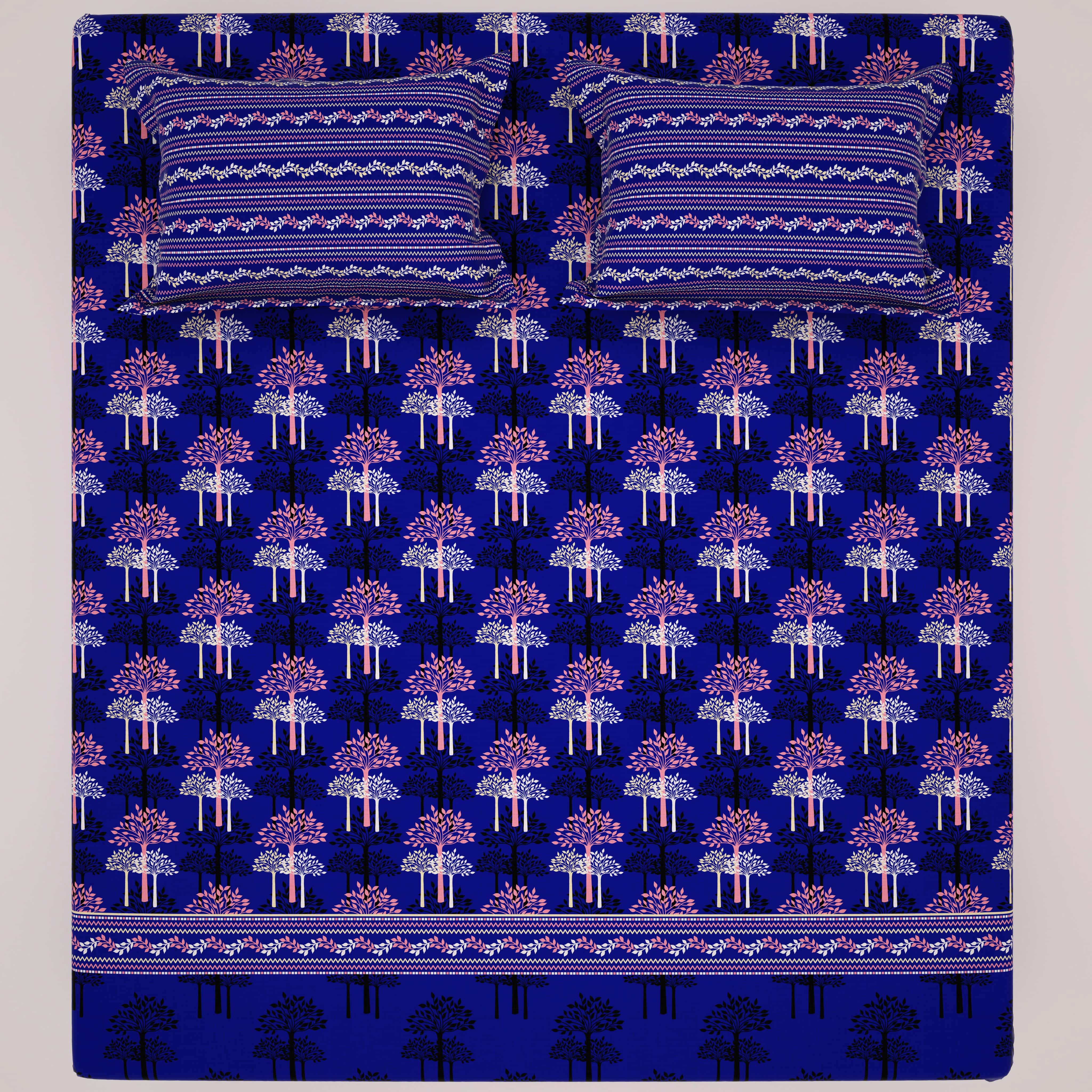 Xara Royal Blue Tree Motif/Grid Pattern Bed Sheet Set - 8679-8680