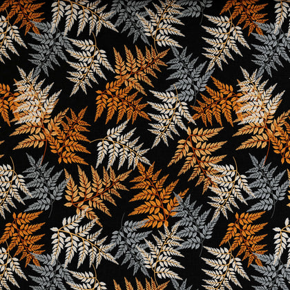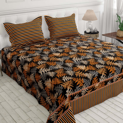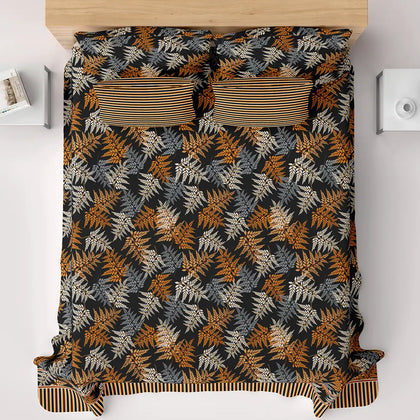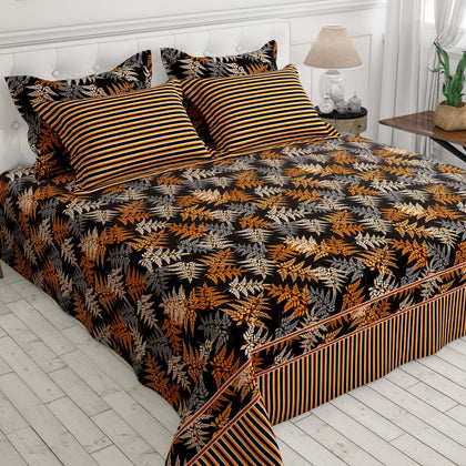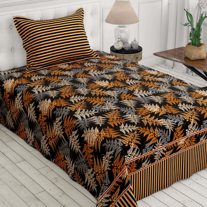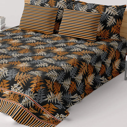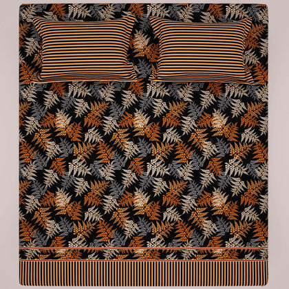 Introduce drama and natural beauty to your space with the Midnight Grove XARA Bedsheet Set. The main sheet features a stunning, dense botanical print of leaves and foliage. The design uses a moody, sophisticated palette of deep black/charcoal as a base, richly contrasted by warm orange/terracotta and cool olive/sage green accents. Crafted from a soft, high-quality fabric, this sheet ensures comfort and durability. The ensemble includes matching pillowcases that feature a contrasting horizontal stripe pattern in coordinating colors, adding an element of modern structure to the organic print. This set offers a cozy, unique, and elegant style.
