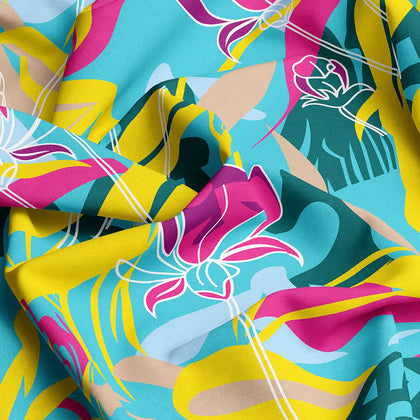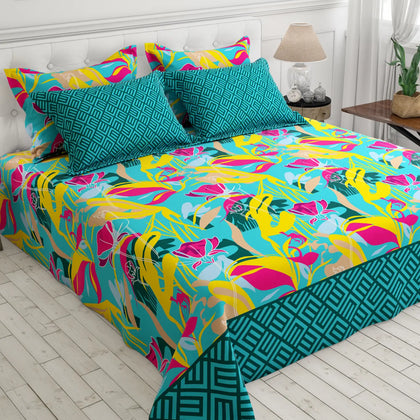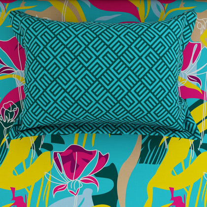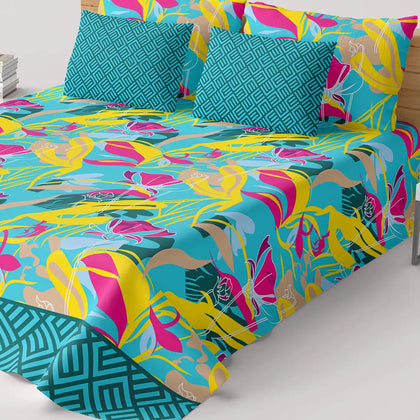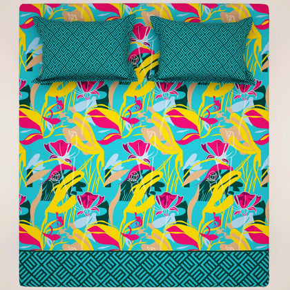 Make a bold, artistic statement with the Pop Art Tropical XARA Bedsheet Set, a vibrant celebration of color and modern design. The main sheet features an energetic, large-scale tropical abstract print using a stunning palette of electric yellow, hot pink, and lime green on a turquoise base. This sheet is perfectly paired with a contrasting border skirt that features a structured geometric print in a rich teal. Crafted from a soft, high-quality fabric, this sheet ensures comfort and durability. With solid teal, patterned throw pillows that complete the look, this set is ideal for anyone seeking to infuse their bedroom with a maximalist, fun, and artistic style.