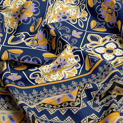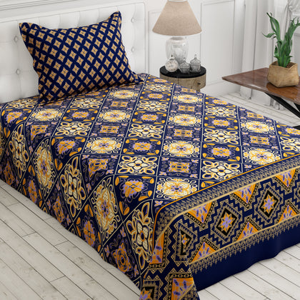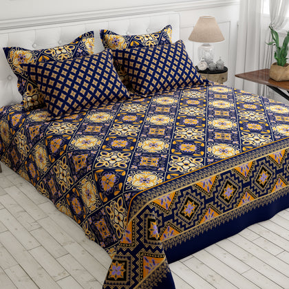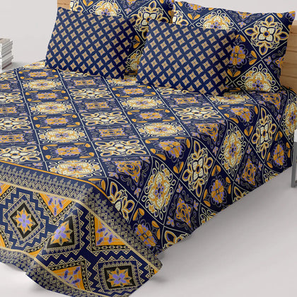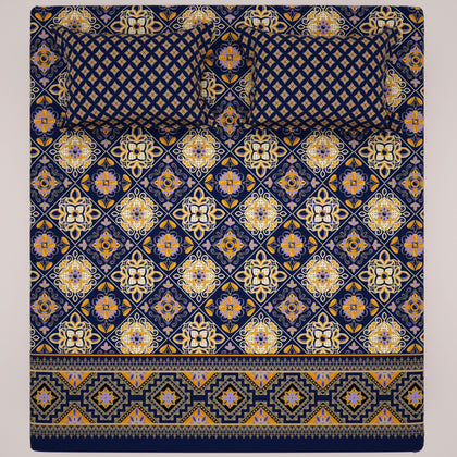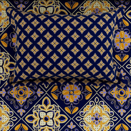 Transform your bedroom into a Cozy Artisan bedsheet set.The sheet's background is a deep navy blue or dark indigo, providing a dramatic contrast for the bold, geometric motifs rendered in mustard yellow/gold and softer purple/mauve tones. The design suggests a traditional ethnic vibes.Crafted from a soft and durable Cotton Blended fabric.