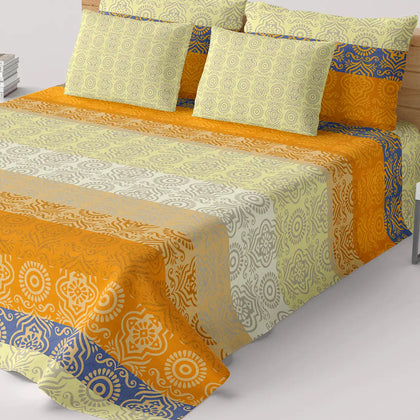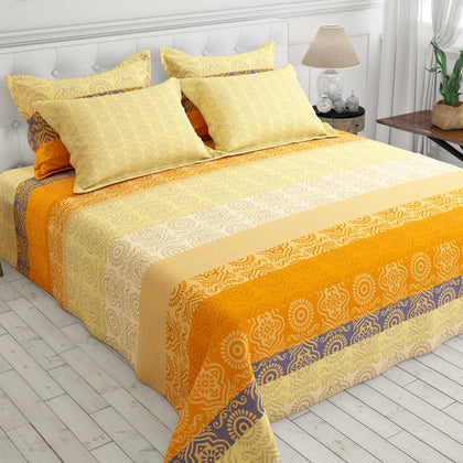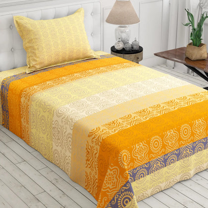 Illuminate your space with the warmth and texture of the Sunset Medallion Stripe Bedsheet Set. This design features broad, horizontal bands alternating in pattern and color. The palette is dominated by warm gold and sunny yellow, beautifully balanced by a richly textured band of burnt orange/terracotta and deep navy blue medallion motifs. This layering creates a visually stunning, dimensional effect. The smooth fabric ensures a soft, comfortable feel, making this set a vibrant yet cozy choice for bringing a rich, artistic warmth and global-inspired pattern to your bedroom decor.