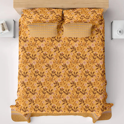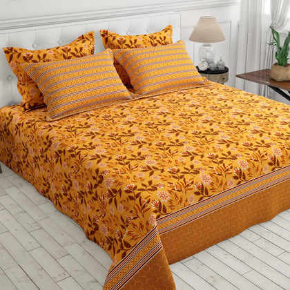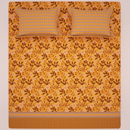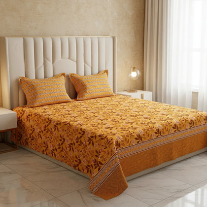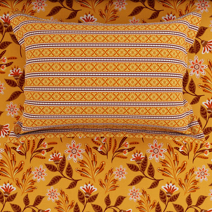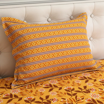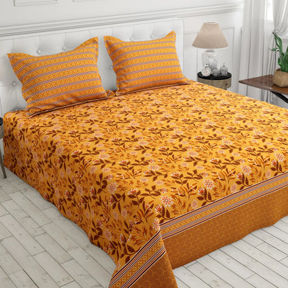 Illuminate your space with the warmth and texture of the Sunset Vein Bedsheet Set. This sheet features a gorgeous, all-over medallion and floral print dominated by a vibrant palette of warm gold and rich burnt orange/terracotta. The design includes fine botanical details that resemble natural veins, giving the set its striking name. The sheet is beautifully framed by a coordinating striped border in deeper earthy tones. Crafted from smooth fabric for a comfortable feel, this set is a cozy and artistic choice for bringing rich, sunny warmth and a global-inspired pattern to your bedroom.