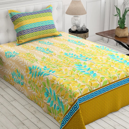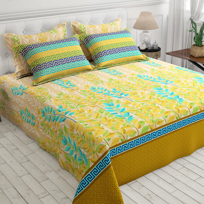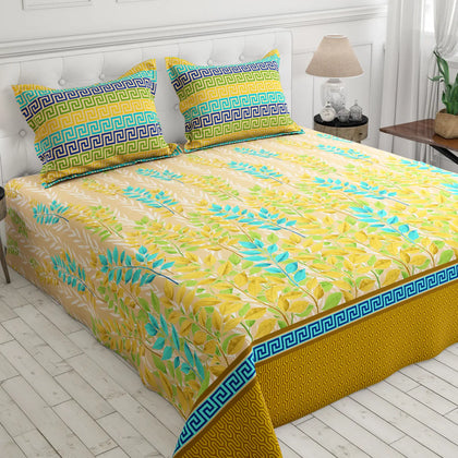 Energize your bedroom with the fresh, sun-drenched style of this Yellow Leaf Geometric Cotton Blended Sheet Set. Crafted from a comfortable cotton blended fabric, these sheets strike a perfect balance, offering the breathable softness of cotton alongside the enhanced durability and easy-care properties of a blend.The sheet features a lively botanical motif of yellow and refreshing turquoise leaves set against a neutral tan/yellow background. Adding an unexpected touch of classical elegance, the design incorporates a bold Greek key (or meander) border in rich blue and turquoise along the edge. The pillowcases echo this detail with a vibrant striped geometric pattern. This set is a perfect choice for bringing a fun, stylish, and durable bedding option into your home.