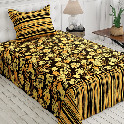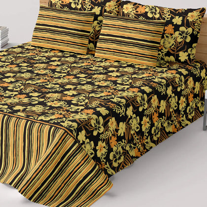 This design is a bold, maximalist combination of floral and geometric stripes, creating a rich and opulent look.The primary colors are a deep, contrasting Black and a vibrant, warm Gold/Yellow. Touches of brown or sepia tones fill in the floral motifs, enhancing the richness and depth.This area features a dense, all-over pattern of large floral and leaf motifs.The smooth finish suggests a comfortable, breathable fabric, consistent with a cotton-blended material.