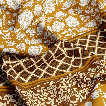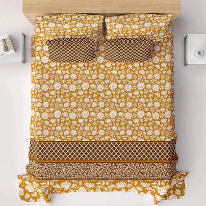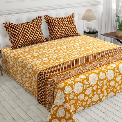 Brighten your bedroom with the cheerful style of this Warm Bloom Cotton Blended Sheet Set. Made from a comfortable cotton blended fabric, these sheets offer a balance of cotton's soft, breathable feel and the enhanced durability and ease of care that a blended fabric provides, making them perfect for everyday use.The striking design features an all-over print of large white florals against a vibrant warm yellow or mustard background. The pattern is beautifully accented by a bold, decorative band of rich brown floral and geometric patterns, which also appears on the pillowcases. This rich, inviting color combination and detailed design bring a cozy, energetic, and sophisticated warmth to your sleeping space.