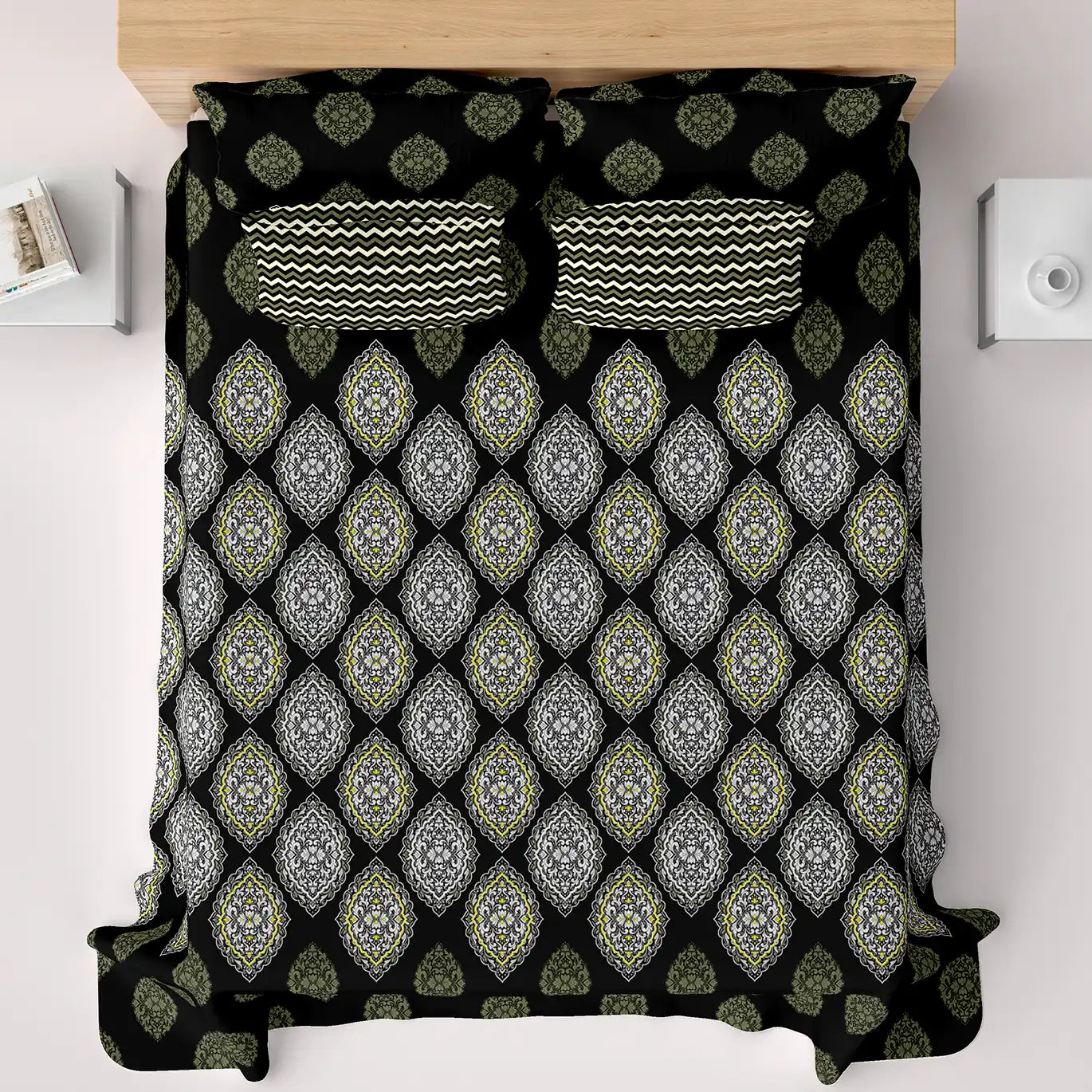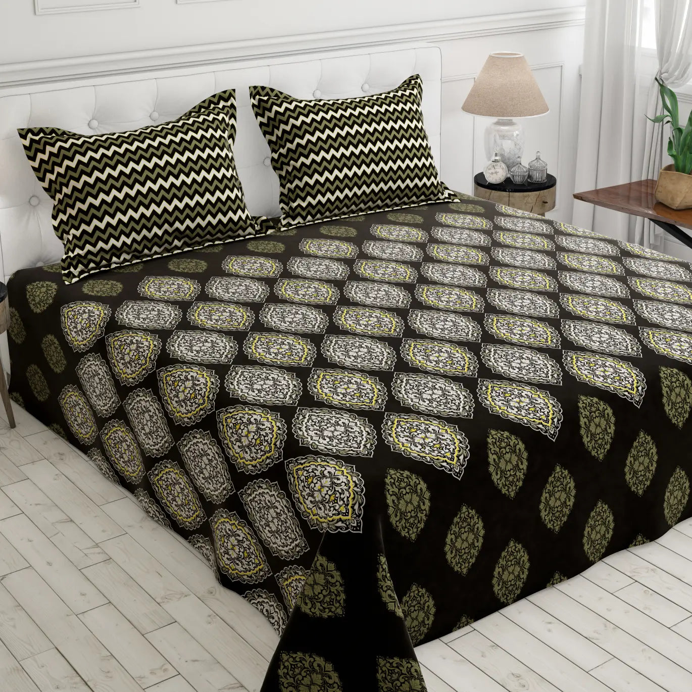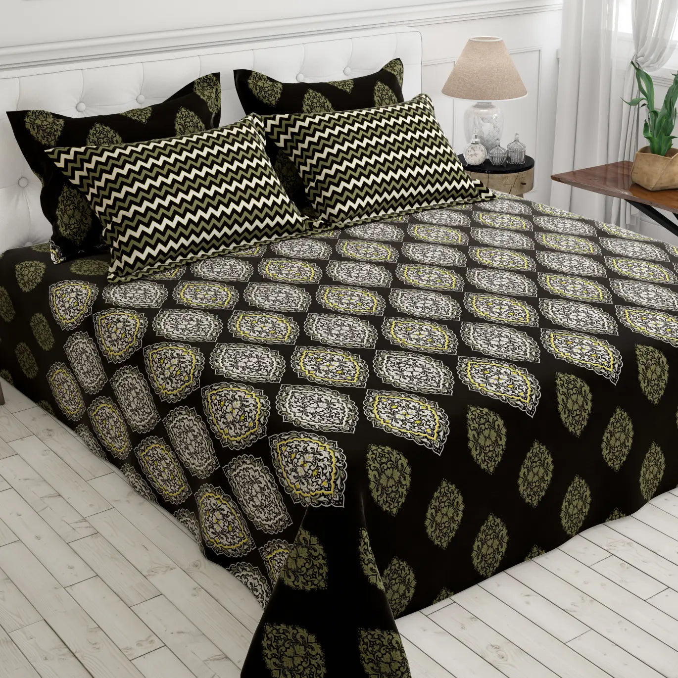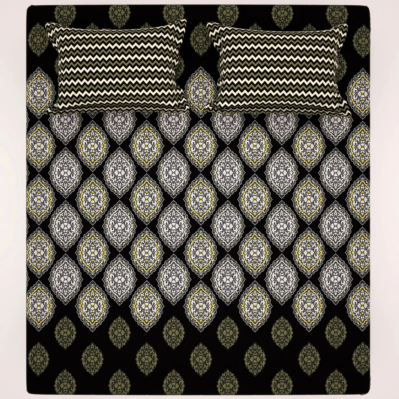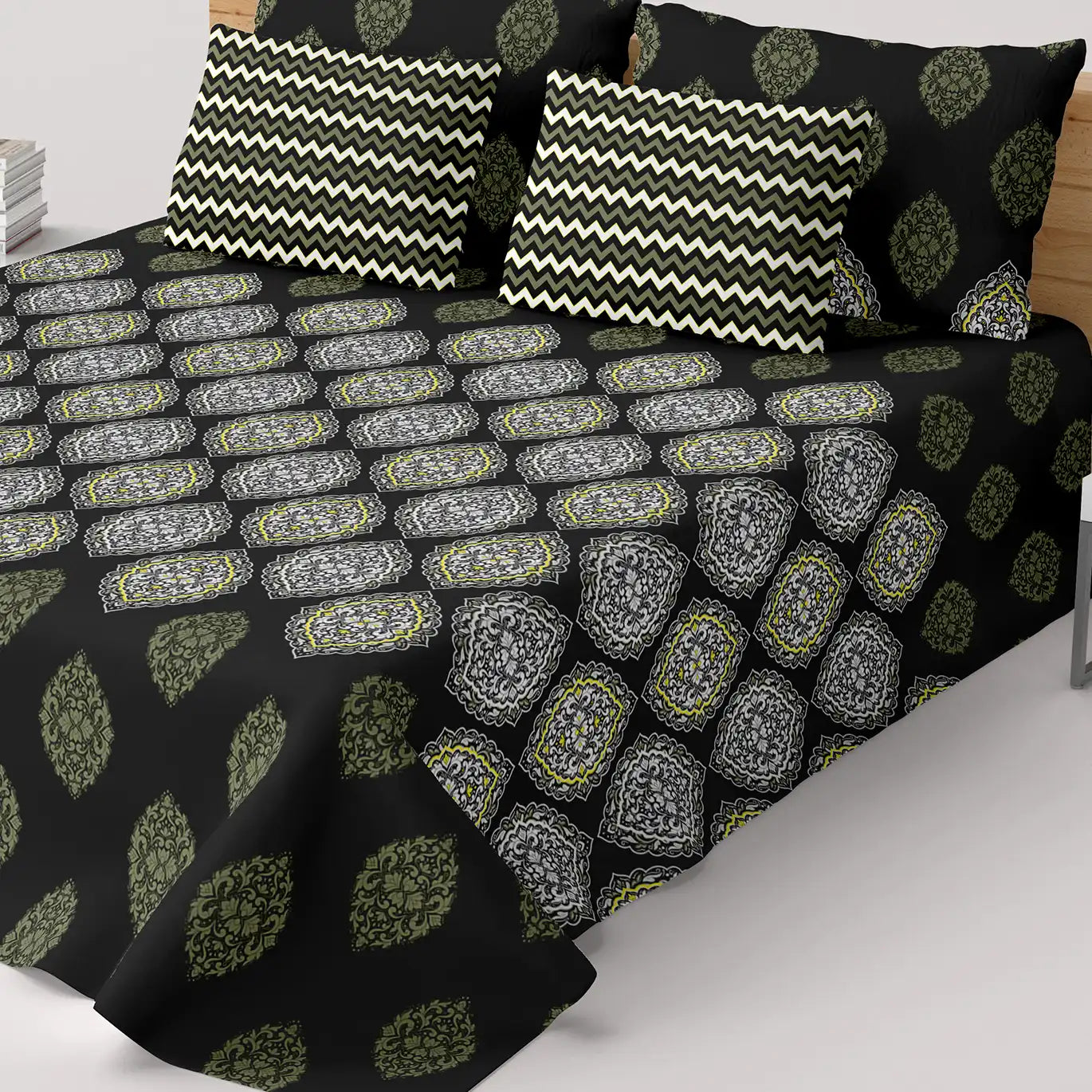Wrap your bed in opulence with this Bedsheet Set, featuring a truly captivating and ornate motif design. This luxurious bedding showcases a deep black background that provides a dramatic canvas for the intricate, repeating pattern.The accompanying pillow covers feature a coordinating geometric chevron or stripe pattern,Crafted from a premium cotton-blended fabric, this bedsheet offers the perfect blend of softness, breathability, and durability.