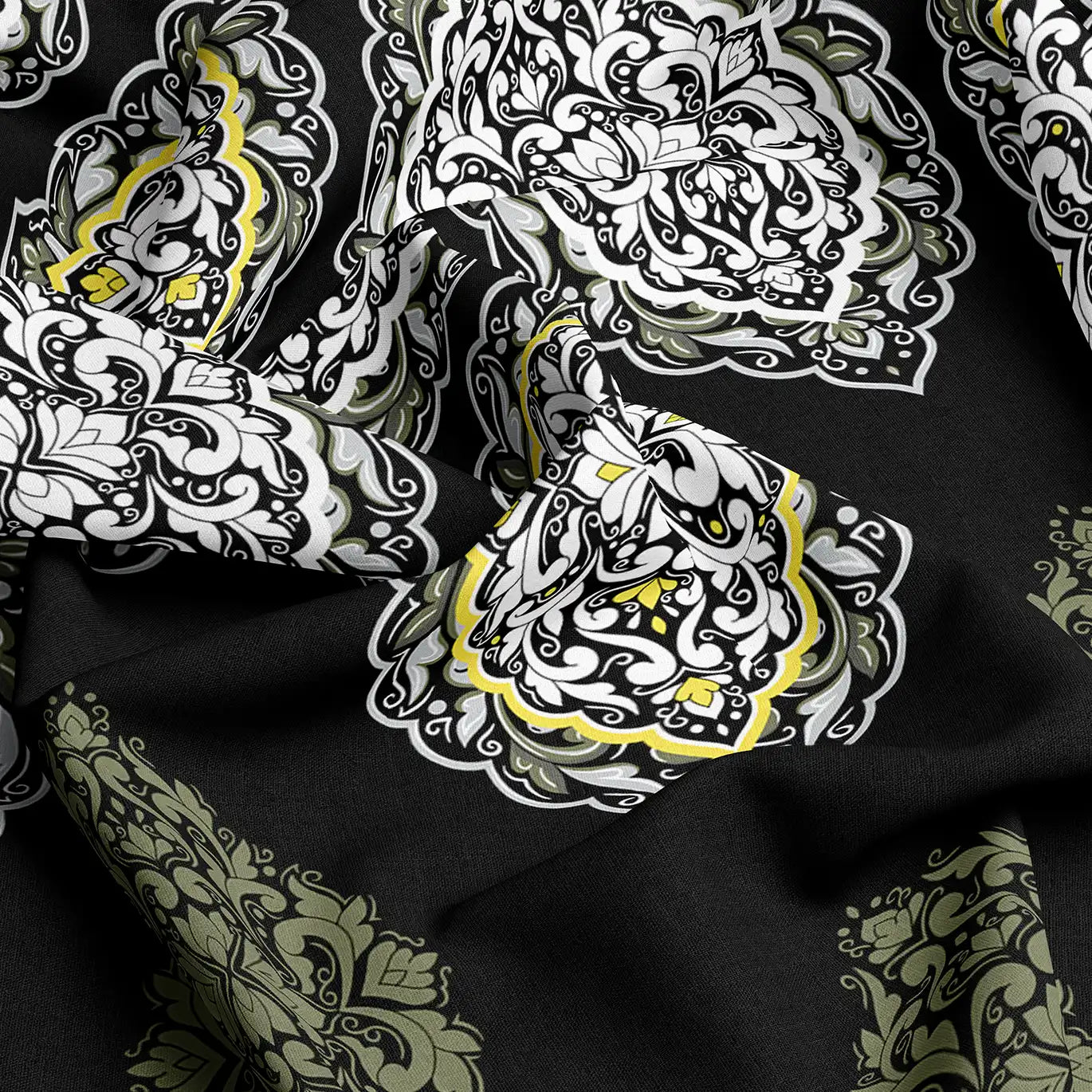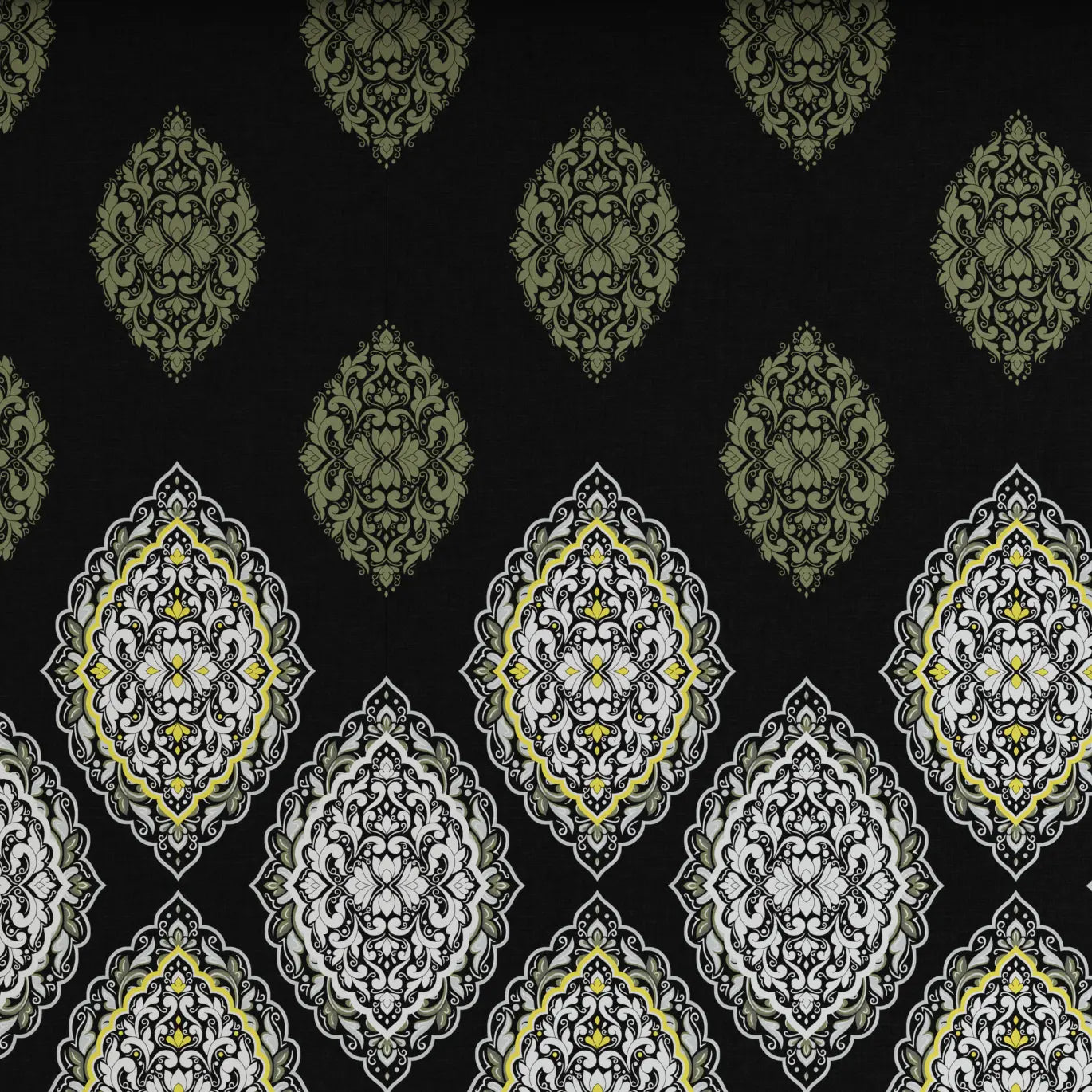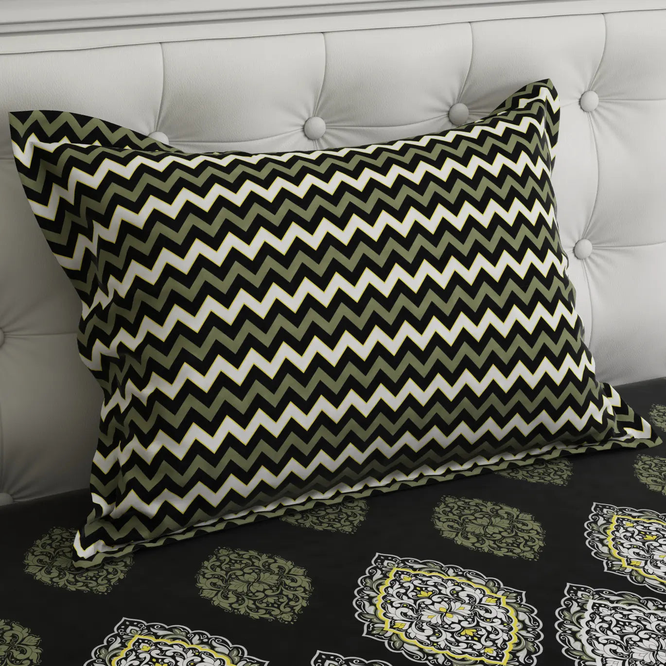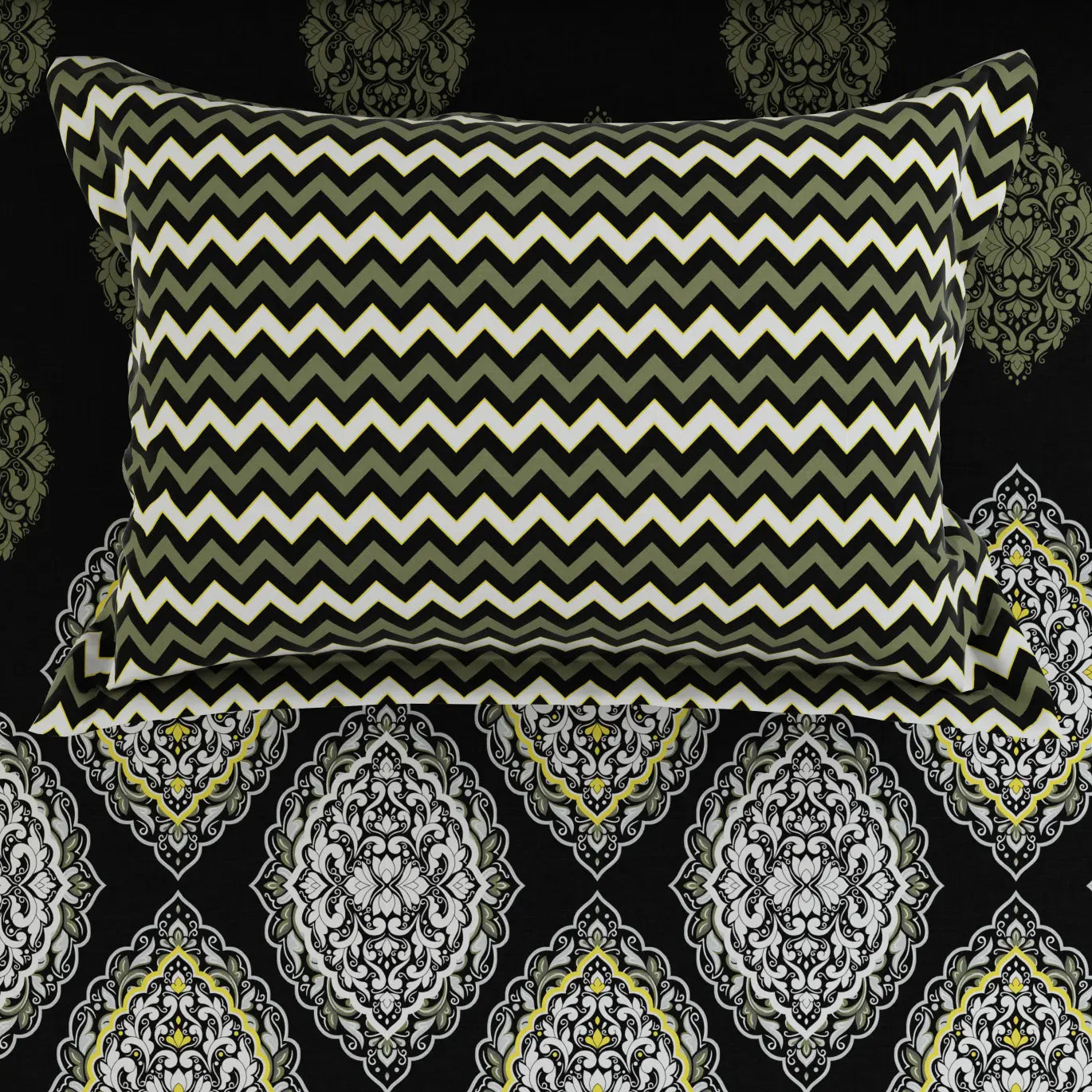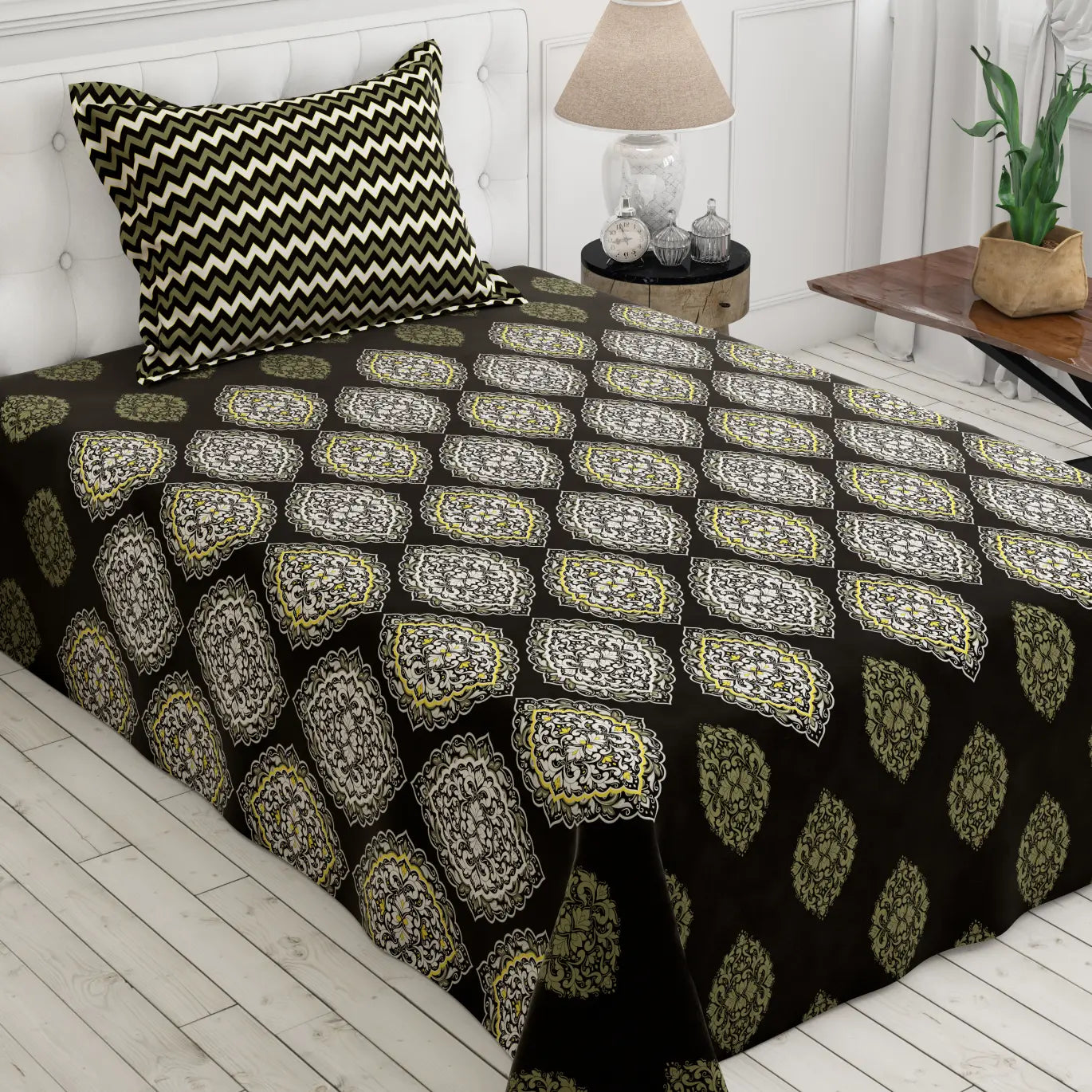 Wrap your bed in opulence with this Bedsheet Set, featuring a truly captivating and ornate motif design. This luxurious bedding showcases a deep black background that provides a dramatic canvas for the intricate, repeating pattern.The accompanying pillow covers feature a coordinating geometric chevron or stripe pattern,Crafted from a premium cotton-blended fabric, this bedsheet offers the perfect blend of softness, breathability, and durability.